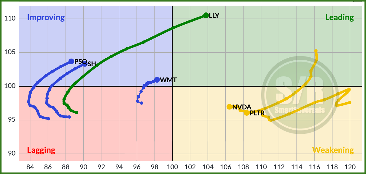 Find which stocks cryptocurrencies or ETFs are lagging or leading but with potential reversal setups, and which ones have bullish or bearish momentum.