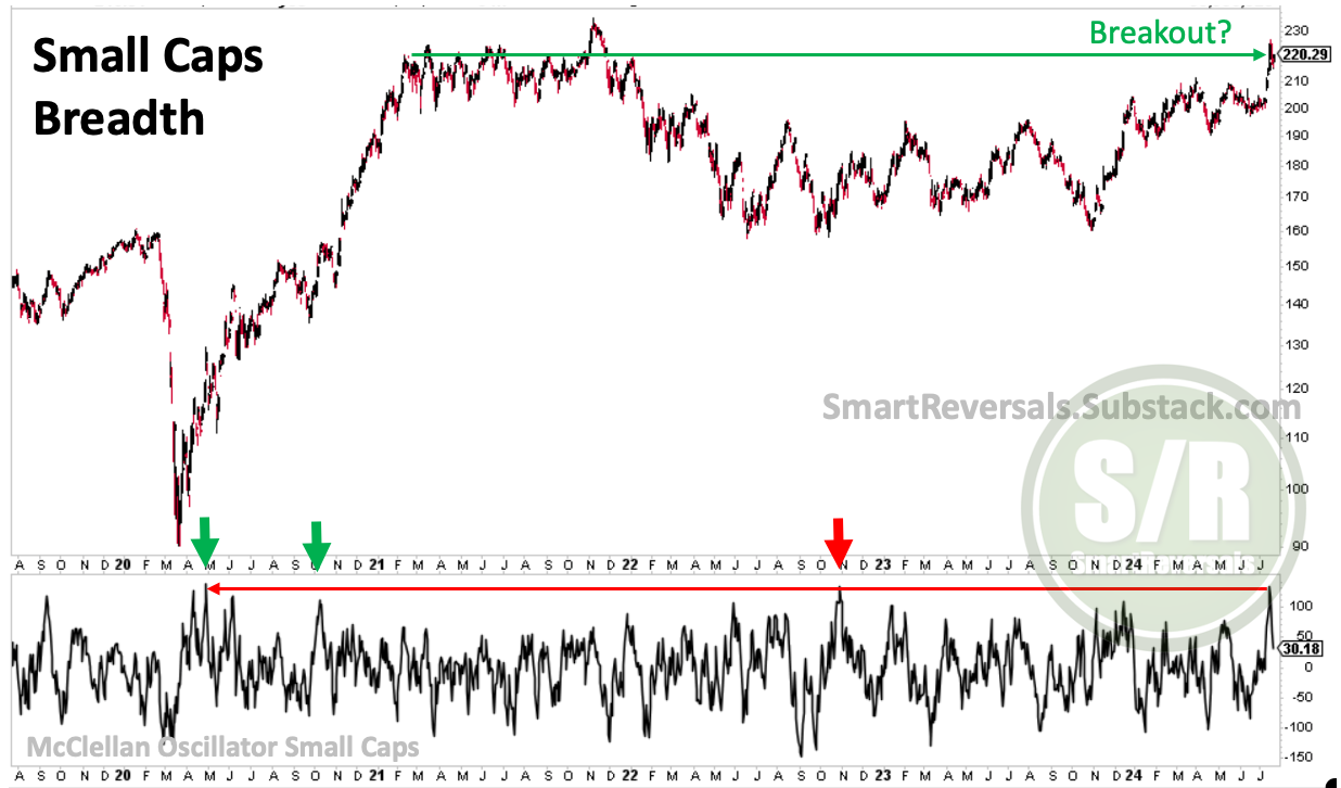 The McClellan Oscillator has reached levels not seen since the 2020 bounce from the COVID crash, suggesting a potentially positive market context. However, as the red arrow highlights, there was a similar instance where prices did not continue to soar but instead declined.