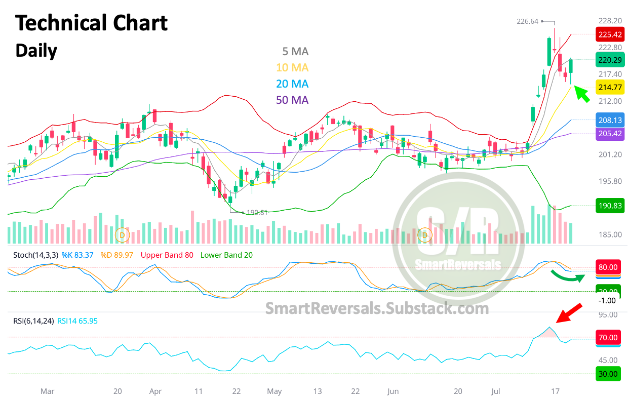 The technical chart shows a bounce from the 10DMA, which is a common pattern in bullish trends when price retraces to that moving average from a jump above the Bollinger Band.