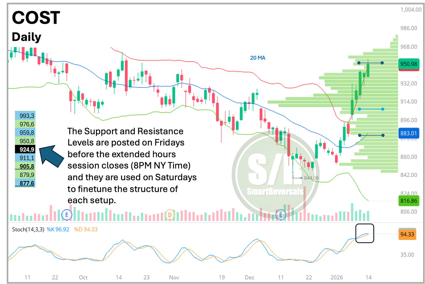 Let’s study COST. After breaking out from oversold conditions last week, the price action signaled a bullish continuation (as noted in the latest Weekly Compass considering additional indicators) with a target of $950.8 (+2.8%). Since the price held above the $905.8 Central Weekly Level (CWL), the bullish path was clear by Monday morning. Today, a trader might choose to lock in gains at the target or navigate the move by trailing their stop higher. The daily timeframe now reaching overbought levels relative to the Bollinger bands and the Stochastic oscillator suggests some consolidation. Not to mention the precision of our target set before the week started!