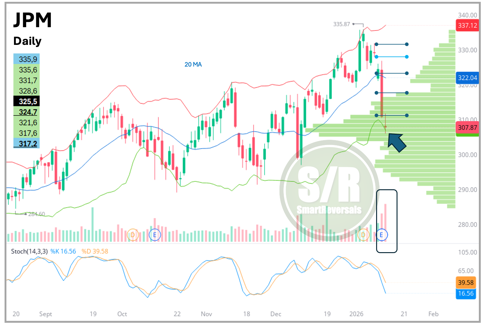 Next, let’s analyze the JPM setup. The Weekly Compass called it as bearish last Saturday. Note the precision of the selloff following Friday’s daily shooting star candle and the subsequent loss of the $324 Central Weekly Level (CWL). Paid subscribers have had access to this level for JPM and 44 other securities since last Friday.