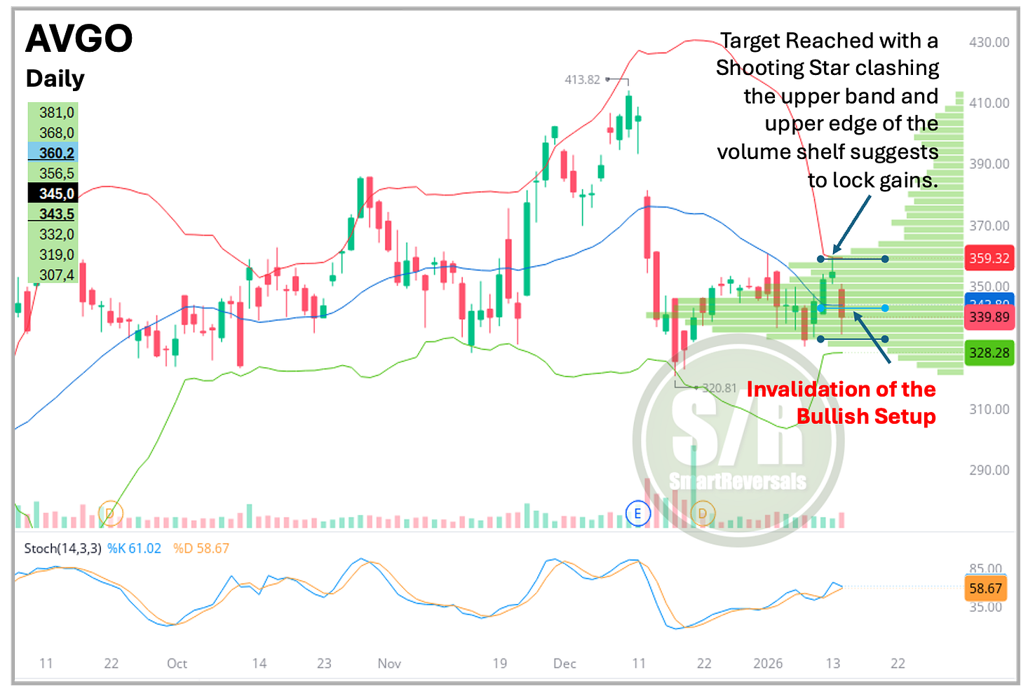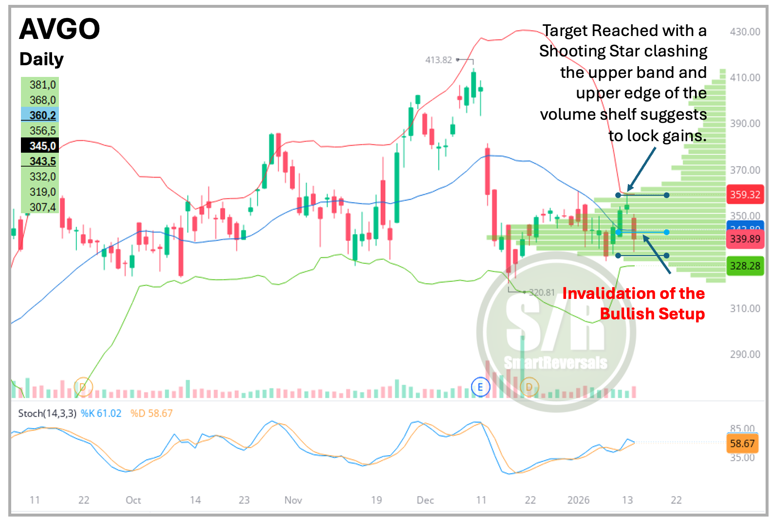 AVGO was another stock with a high probability setup called on Saturday. The CWL of $343.5 was conquered on Monday morning suggesting a clean entry, by Tuesday the target was reached, securing a 3.3% gain. The chart shows a bearish daily shooting star candle that suggested exhaustion and a likely reversal considering the confluence of resistance levels, starting from our target, the upper Bollinger band, and the volume shelf. Locking gains was wise, the recent selloff is not a technical surprise, and considering the breach of $343.5, there is an invalidation of the bullish setup for now, but we made a decent 3.3% gain.