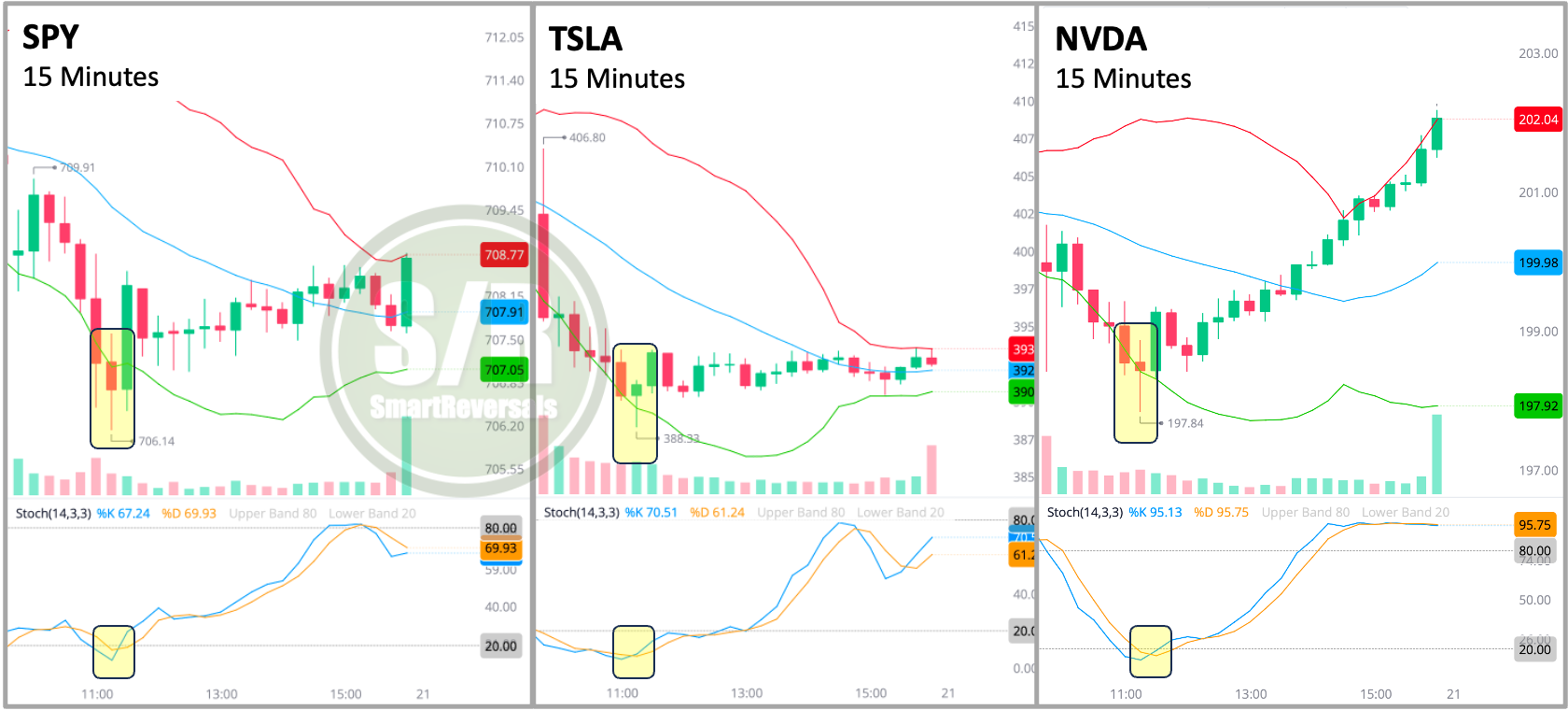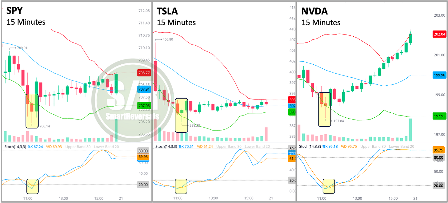 For example, look at the 15-minute chart for NVDA: at 11:15 AM, a reversal candle printed at 198.5 (our second support level for the day posted yesterday). From that precise point, the price rallied, recovering from a -1.6% drop to close back above its CDL of 200.