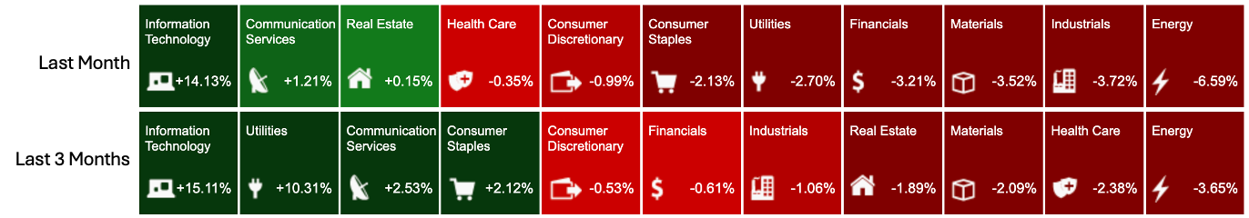 Sector performance within the S&P 500 shows notable strength in technology over the past three months, with most other sectors in negative territory; the situation is worse for the last month.
