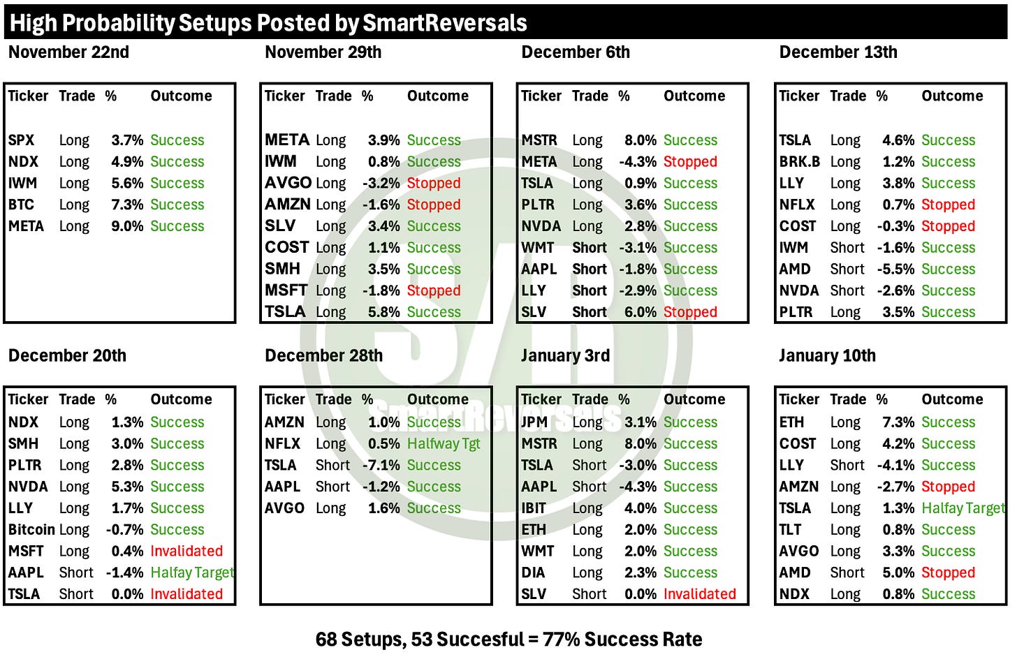 Success in the markets is built on disciplined technical analysis and the precise execution of price targets. This week, 7 of our 9 high-probability setups were successful, providing our subscribers with clear, actionable insights.