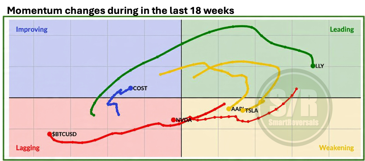 Individual Setups: We perform deep technical analysis on every security for a specific reason: Relative Strength in a map does not rule out overbought conditions. I recently anticipated this for AAPL, TSLA, LLY, and JPM, forecasting pullbacks despite their strength. Conversely, lagging securities extremely oversold can be primed for a bounce, as seen in my recent successful calls for Bitcoin, Ethereum, and COST. The technical chart with the right indicators is essential.