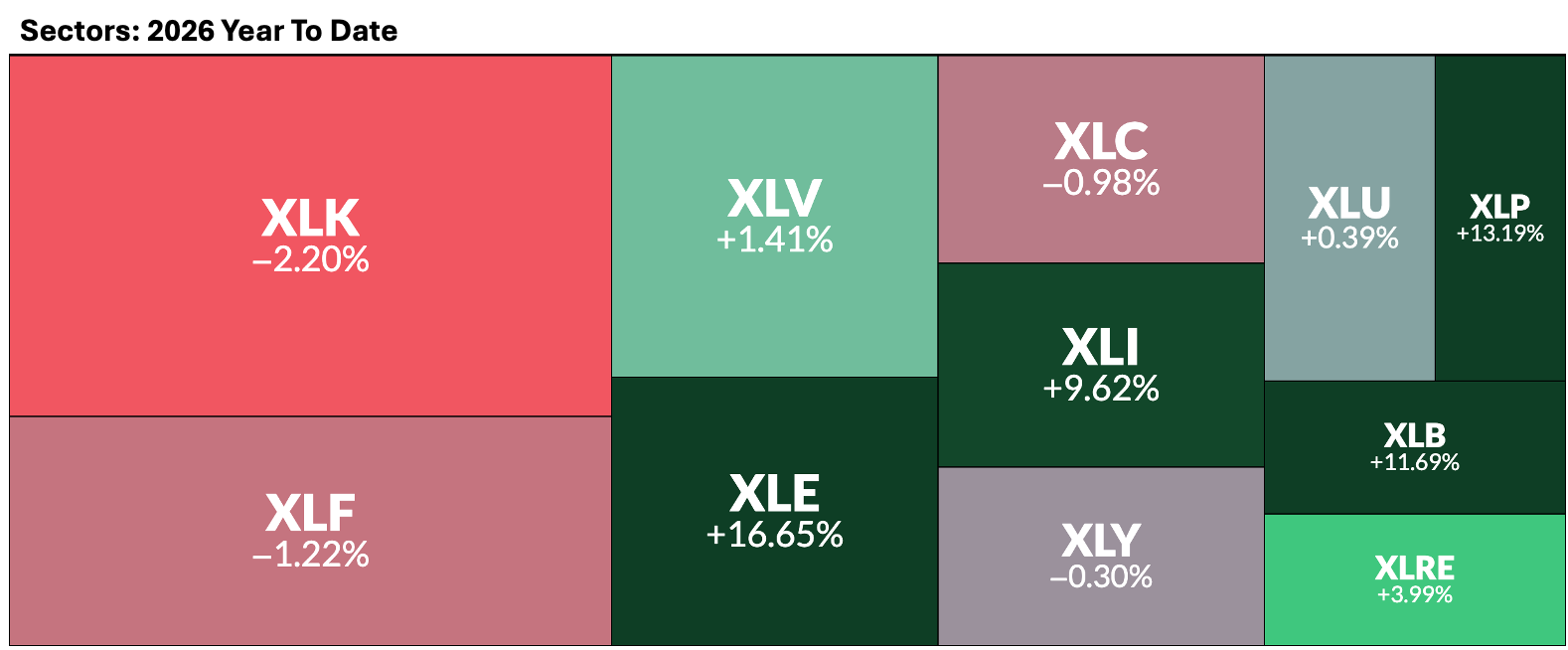 Through the first six weeks of 2026, a stark divergence has emerged in market leadership. While the S&P 500 (SPX) remains near elevated levels, traditional growth engines like Technology and Consumer Discretionary have significantly lagged the broader index. Instead, the heavy lifting is being done by defensive and cyclical sectors, with Consumer Staples, Energy, Industrials, and Materials all outperforming.