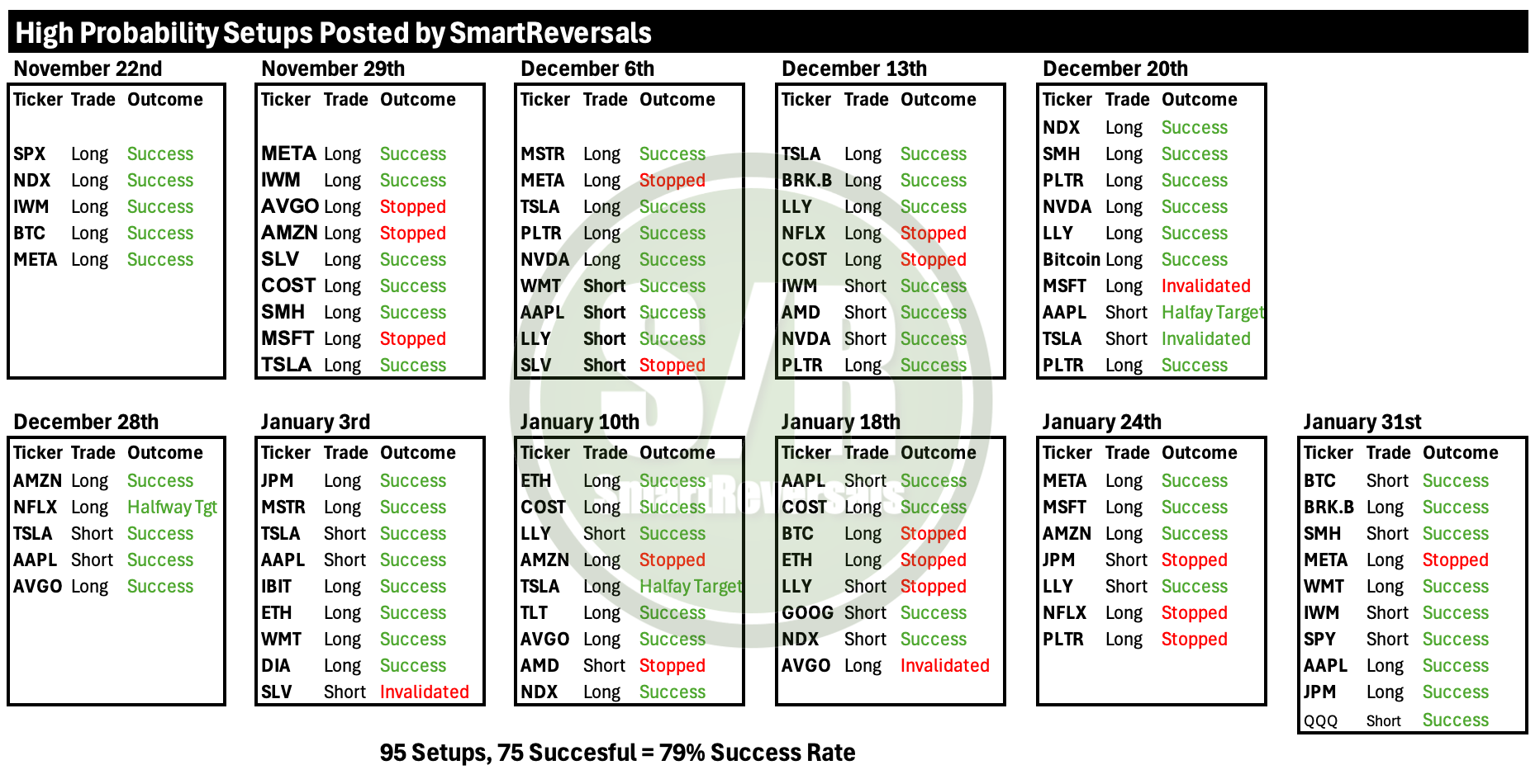 Last week, our High-Probability Setups outperformed in a very volatile week, maintaining a cumulative accuracy record of 79%. The moves in BTC, BRK.B, SMH, WMT, AAPL, QQQ, SPY, and JPM, were anticipated correctly, even for IWM in a very choppy week, securing an average gain of 5% across bullish and bearish setups. Even our only invalidation, META were cut short with a minimal -1.2% loss. This edge comes from trading a constant universe of high-volume, blue-chip securities. My focus on liquid giants ensures our orders get filled and our technical analysis remains reliable. Join the paid plan today to trade with institutional-grade precision.