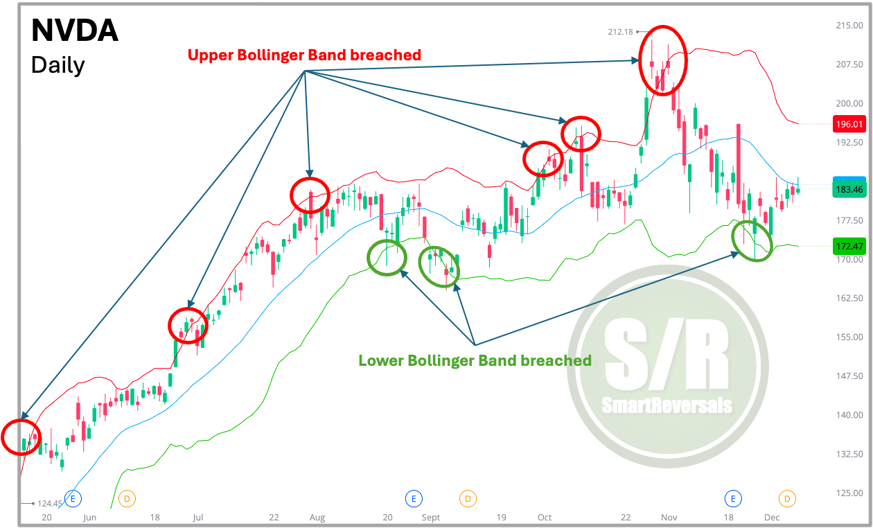 Bollinger Bands: Visualizing Volatility To further refine your view, Bollinger Bands are essential for measuring volatility and identifying extremes. As seen in the fourth chart below, price action tends to stay within these bands. When the price breaches the Upper Bollinger Band, it often signals that the asset is overextended or “expensive” relative to recent volatility. Conversely, a tag or breach of the Lower Bollinger Band can indicate the asset is “cheap” or oversold. This tool is invaluable for spotting mean reversion opportunities where the price snaps back to equilibrium.