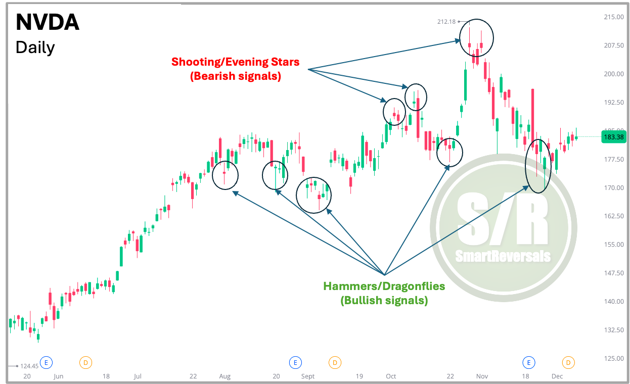 Candlesticks: Reading the Sentiment To get a better sense of market sentiment and potential reversals, traders must switch to candlestick charts. Unlike a simple line, candlesticks tell a detailed story of the battle between buyers and sellers during each time period. As shown in the chart below, specific formations like “Shooting Stars” (bearish signals) and “Hammers” (bullish signals) can anticipate intra-day reversals long before they become obvious trends. Recognizing these patterns allows you to spot exhaustion in a rally or strength in a sell-off.