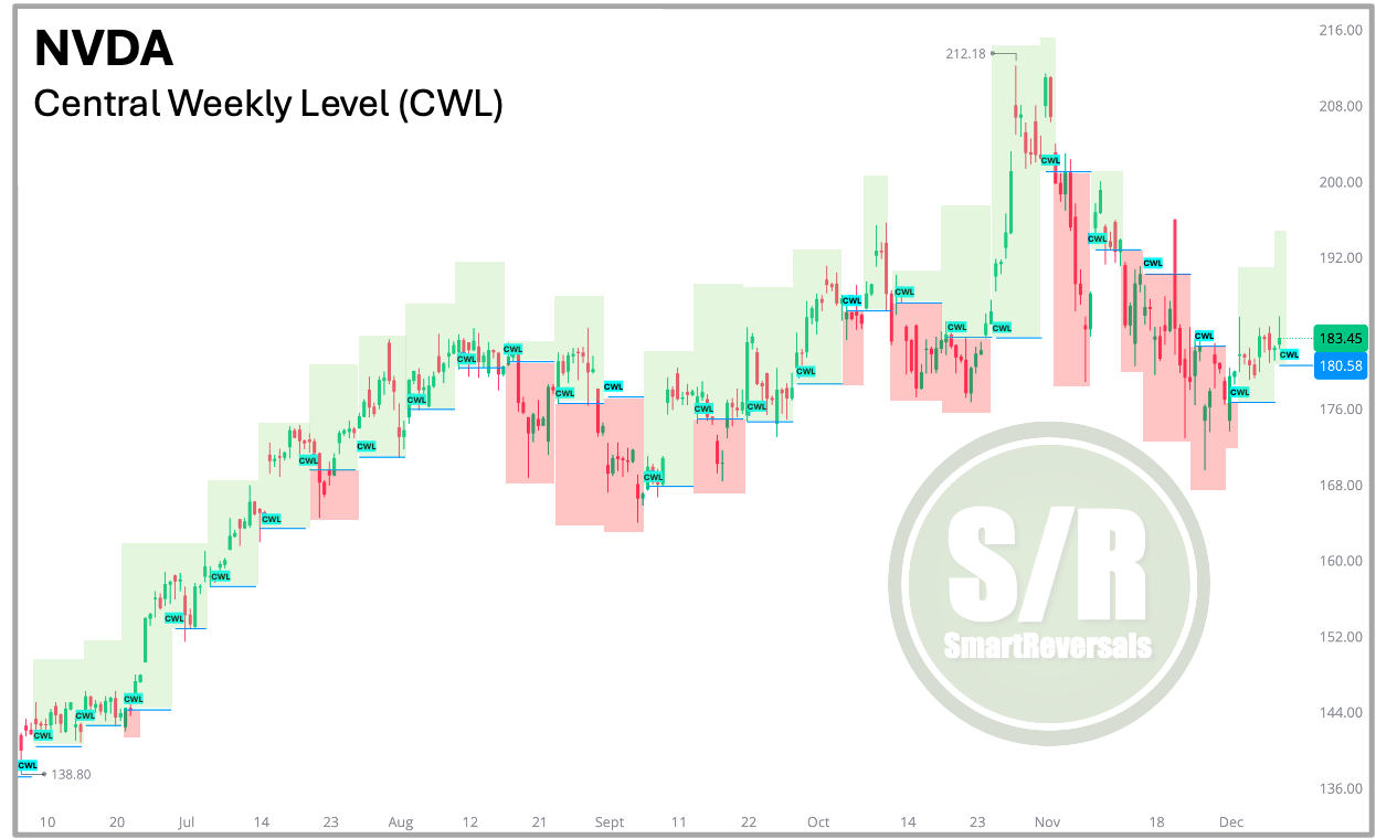 The Ultimate Filter Finally, to avoid waiting until the CML is lost, or the 10 or 20 Moving averages are breached, I use the Central Weekly Level (CWL), it is updated every Friday for the week ahead, and the subscribers can have a clear reference to validate a potential pullback (when the price is overbought and if finally falls below the CWL), or to validate a potential bounce (like the chart below for NVDA:
