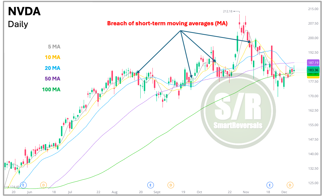 The chart below shows how significant is a loss of the 5 and 10 MA for NVDA. Some traders or investors may consider a loss of those levels a sell-sign, and recovering them a buy-sign. This is not a recommended rule, but an example of having a criteria when analyzing MAs.