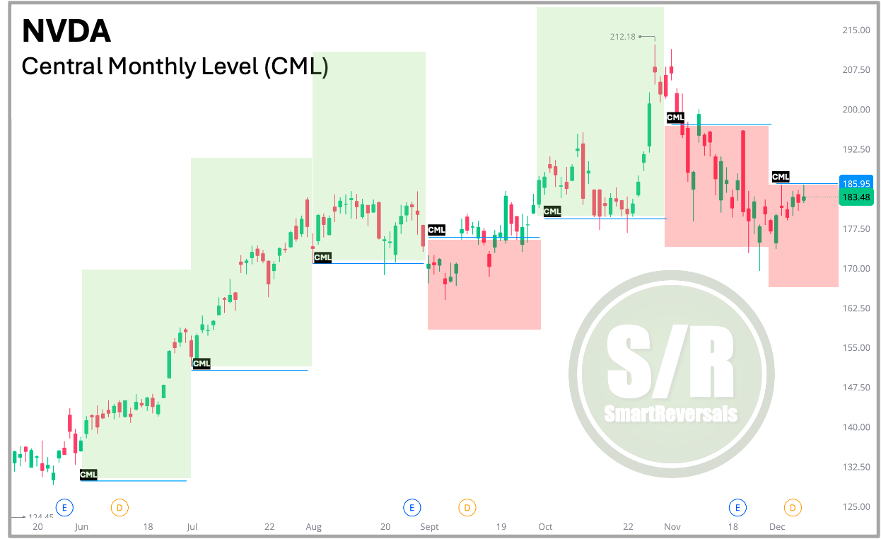 Let’s continue with the NVDA case study, the Central Monthly Level (CML) that has been posted for the month ahead (for example, the CML for December was posted at the end of November), see how relevant the line is.