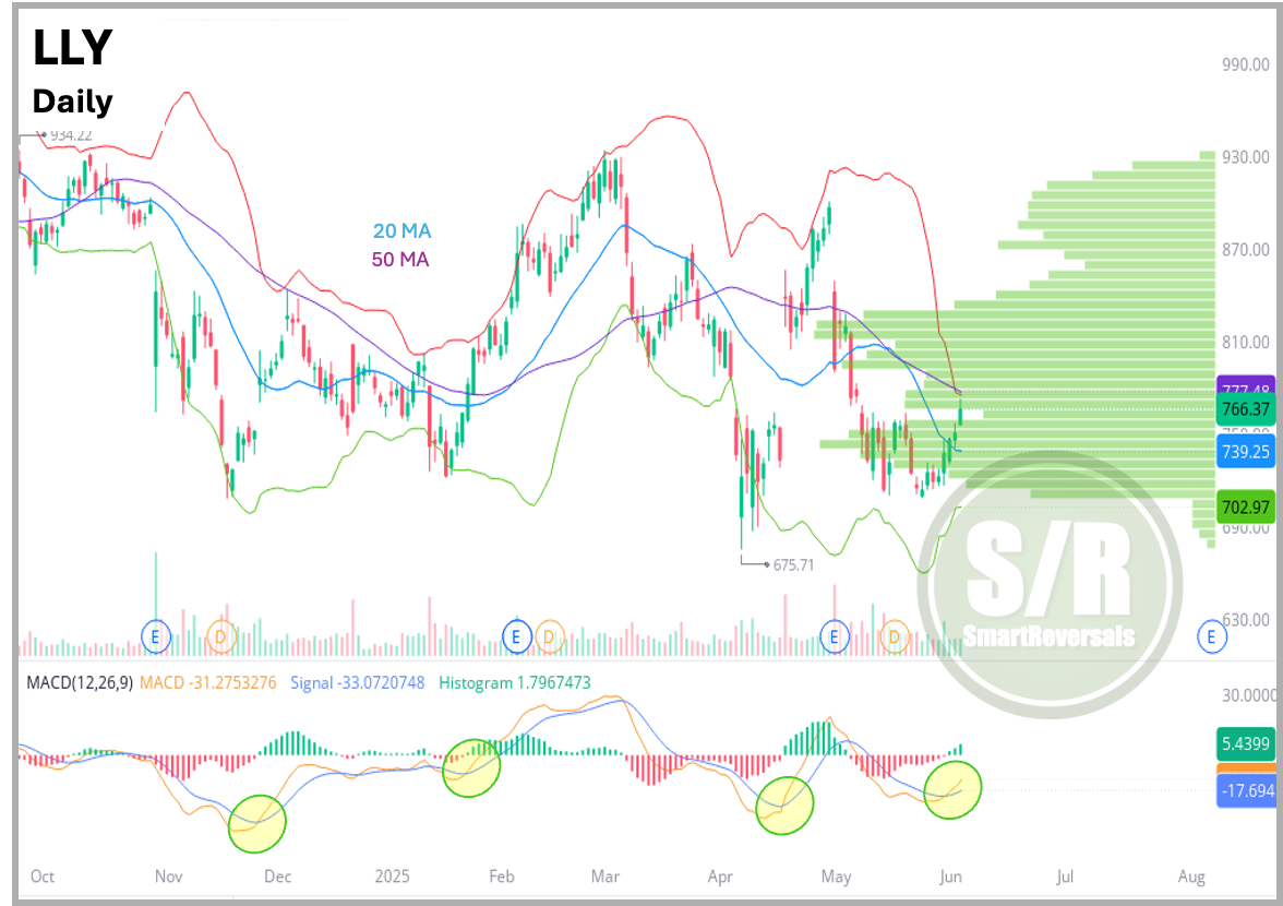 LLY: This non-tech mega cap, that is part of the top 10 or top 15 companies in the SPX by market cap, has been hammered after the last earnings report, finding once again support at the $700 zone (November 2024, April 2025, and May 2025), which is the lower edge of the volume profile. The recent MACD crossover suggests this bounce has more fuel.