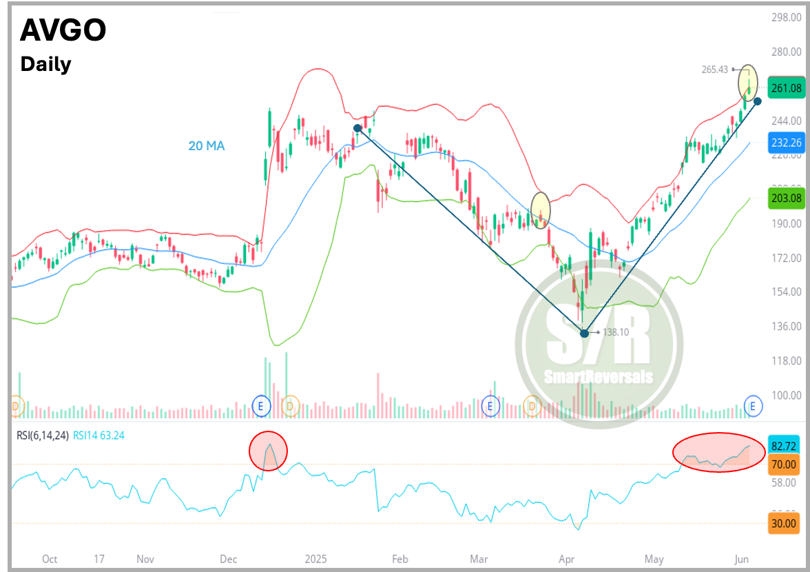 AVGO: Broadcom has reached new all time highs, the V shaped recovery is complete, and the last candle is a shooting star crossing the higher Bollinger band which suggests a consolidation is imminent. The RSI adds more signs of overheated conditions.