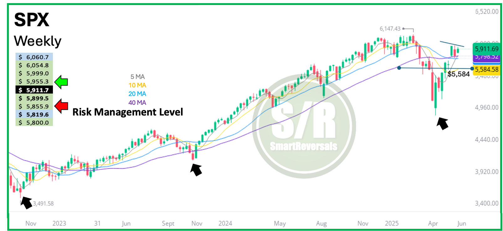The SPX was analyzed with the following chart (and other indicators), setting some risk for the very short term, and $5,899.5 as the reference to manage risk for longs. This is a good example for traders.