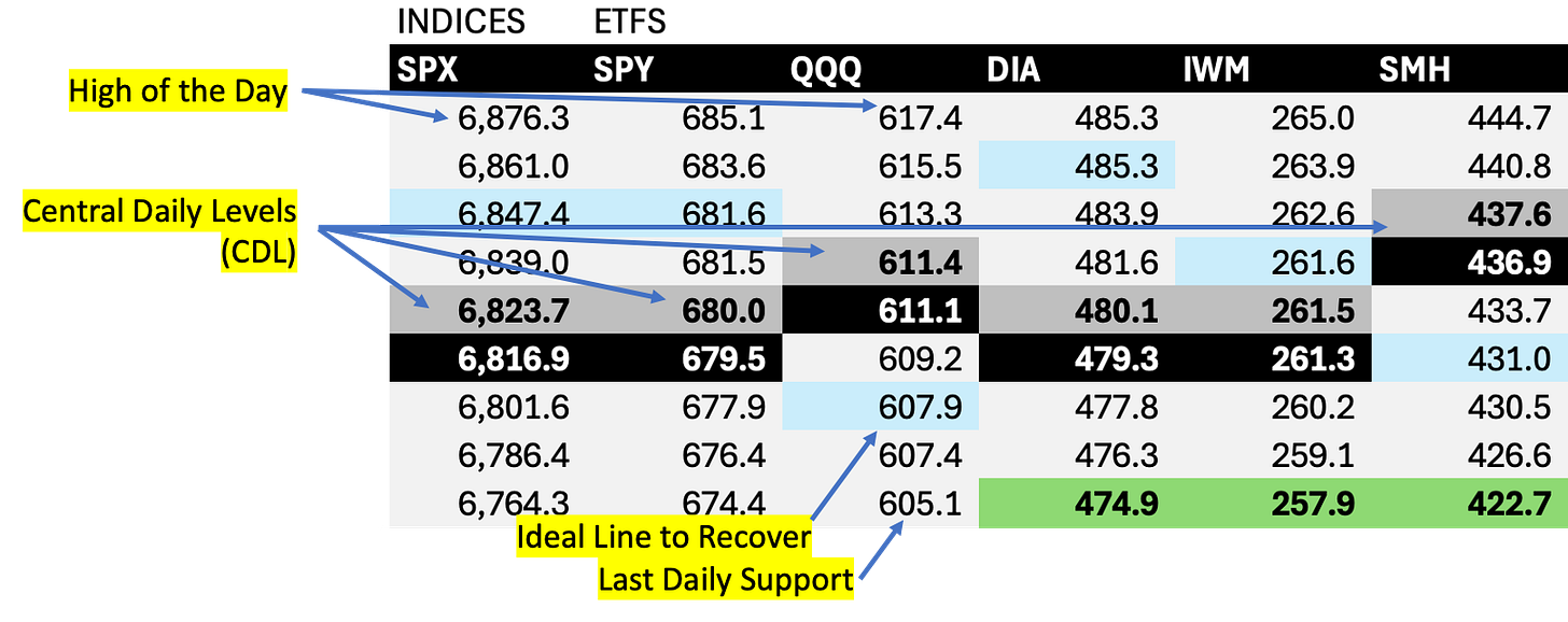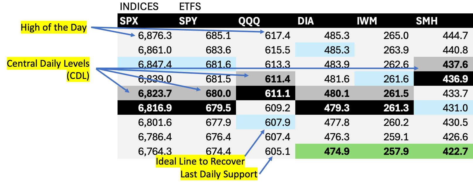 SPX: $6,823 was the essential daily level separating bullish and bearish conditions. After a bounce at the $6,786 support zone at 9:45 AM, a daily bottom emerged, by 9:50 AM, $6,801 was reclaimed, and by 12:20 PM, the SPX formally turned green, launching toward our high daily target of 6,876.