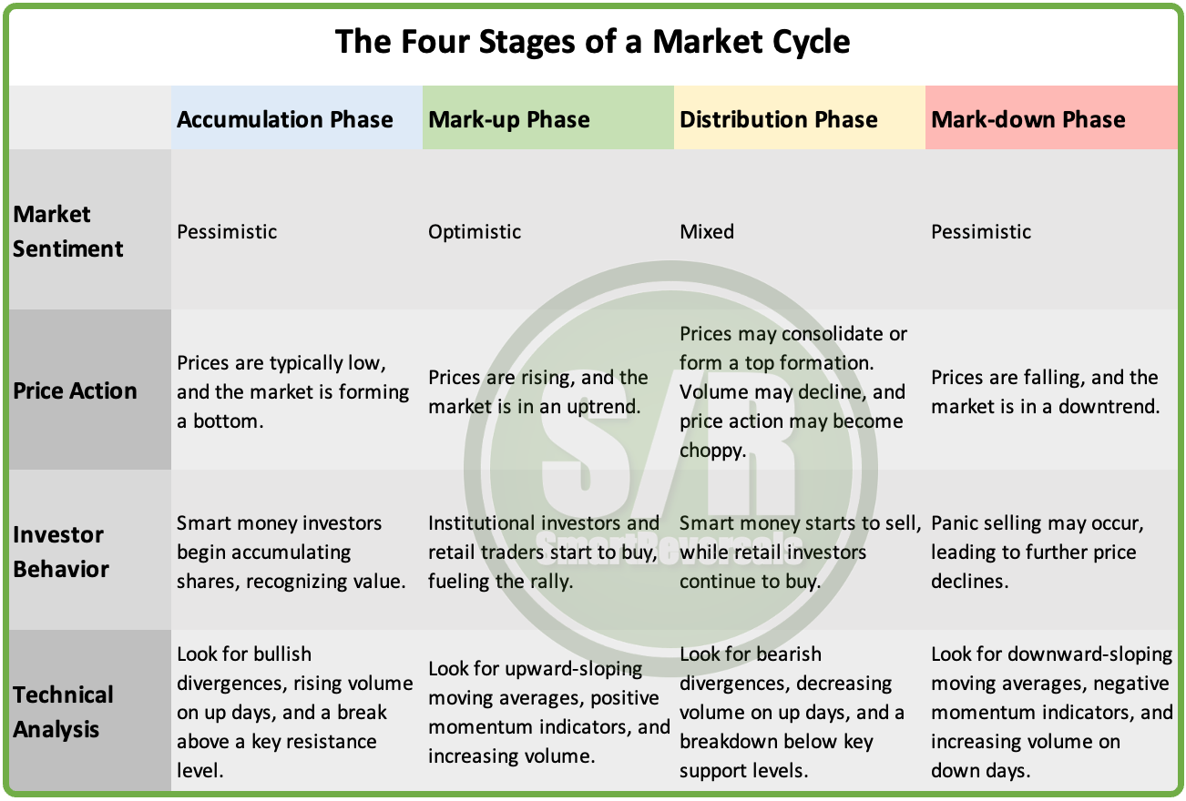 A typical stock market cycle includes four stages: accumulation, markup, distribution, and markdown. Let's delve into each stage with this table: