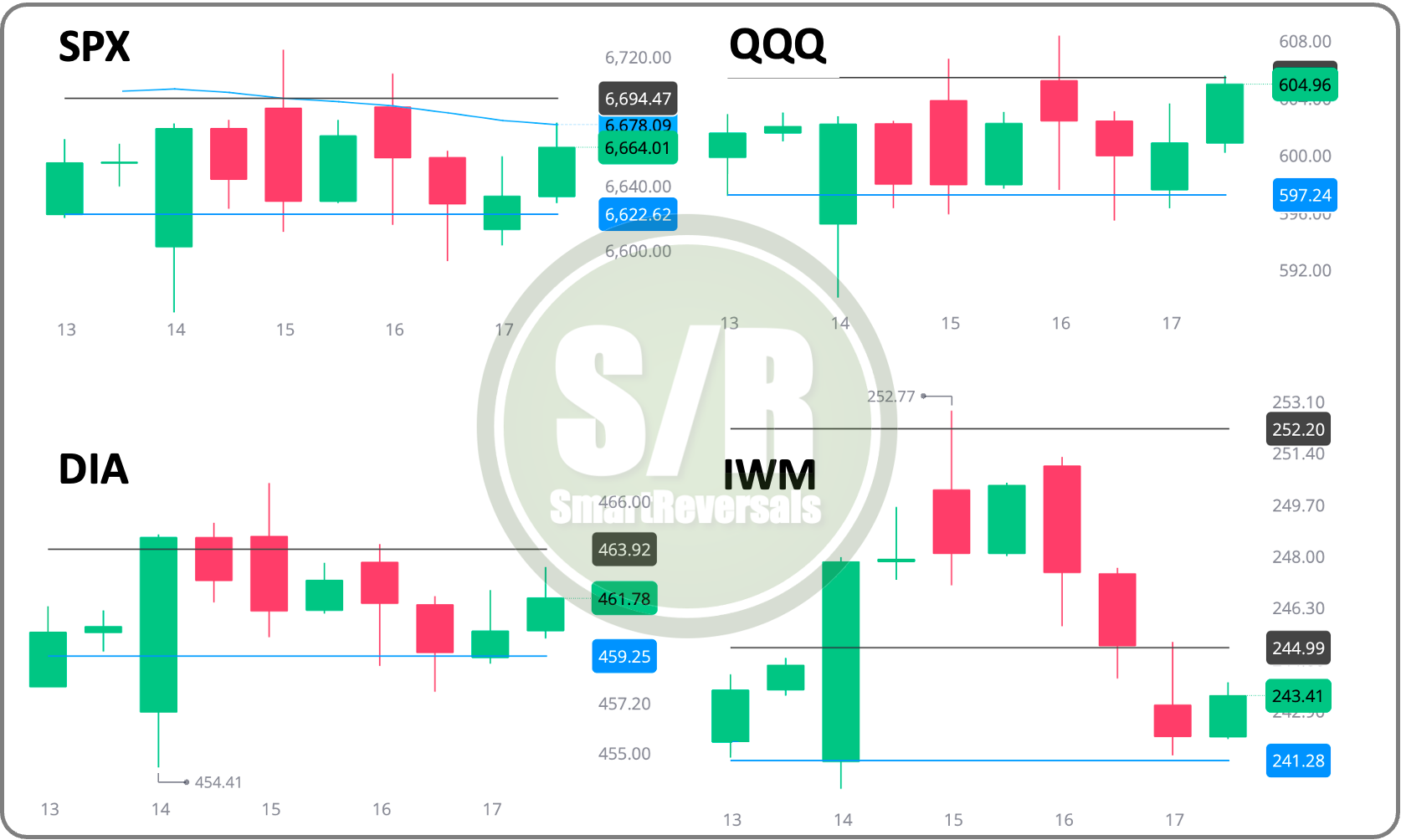 Indices & Futures: SPX, NDX, DJI, IWM, ES=F, NQ=F