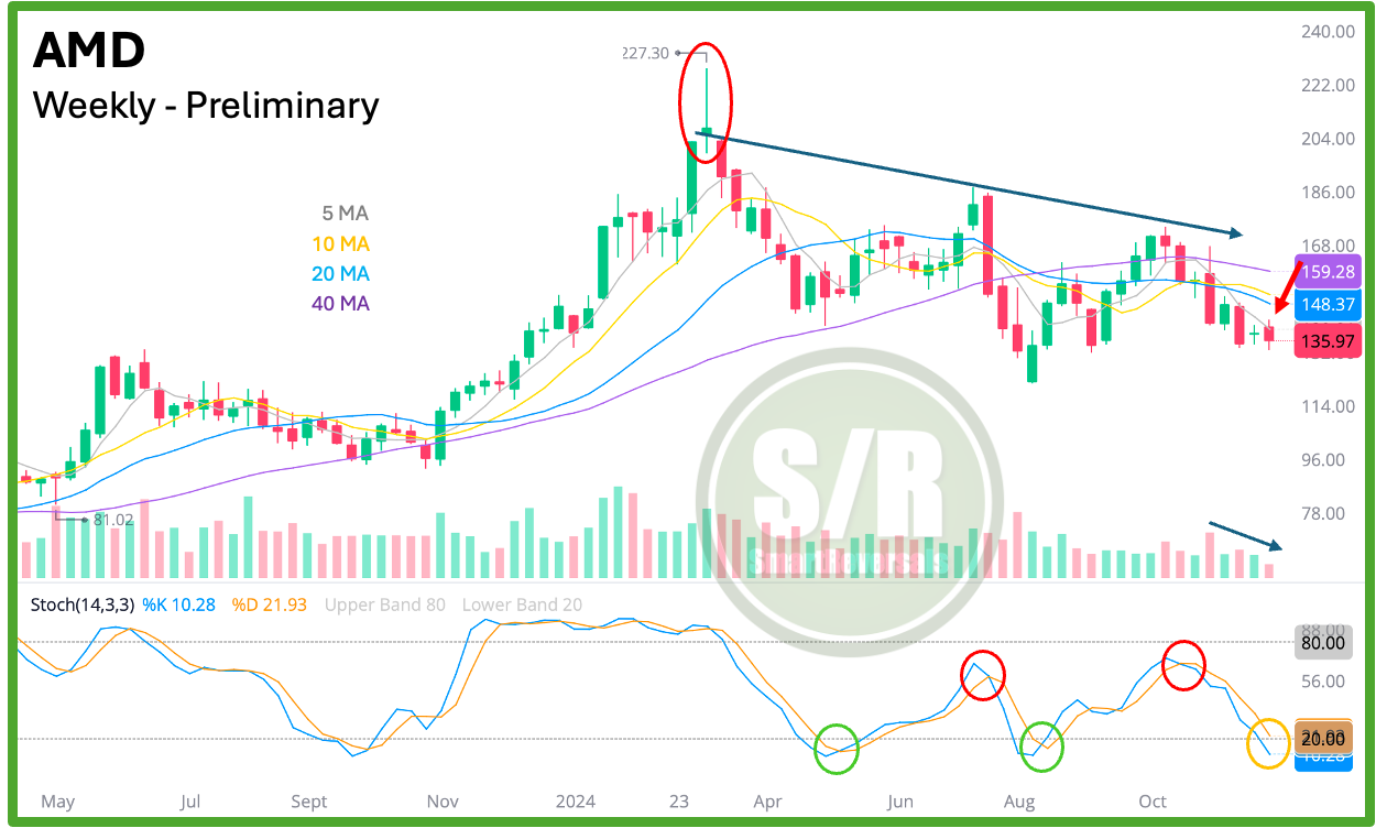 AMD was analyzed in the latest publication, currently the 5 weekly average rejected price action (not good), the series of lower highs is highlighted in the chart. On the potential bounce side, the volume is showing exhaustion, oscillators are in oversold zone and and price action is trying to stay above $135. Let’s analyze the fundamentals to understand the prospects behind AMD’s charts.