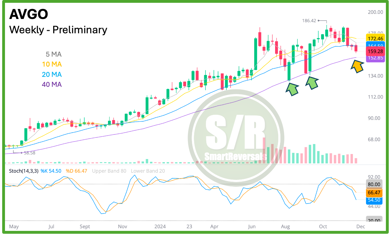 Broadcom (AVGO) has a significant market cap, during the current bull market, the 40 weekly average has supported price in pullbacks, currently the 10 and 20MAs are curling down (which is not good in terms of trend analysis), and $152 looks like the line of defense that is to be tested. Oscillators suggest the move is not complete. Is a buying opportunity on sight for a company with a market cap 3X larger than AMD?. People interested in semiconductors has to observe AVGO.