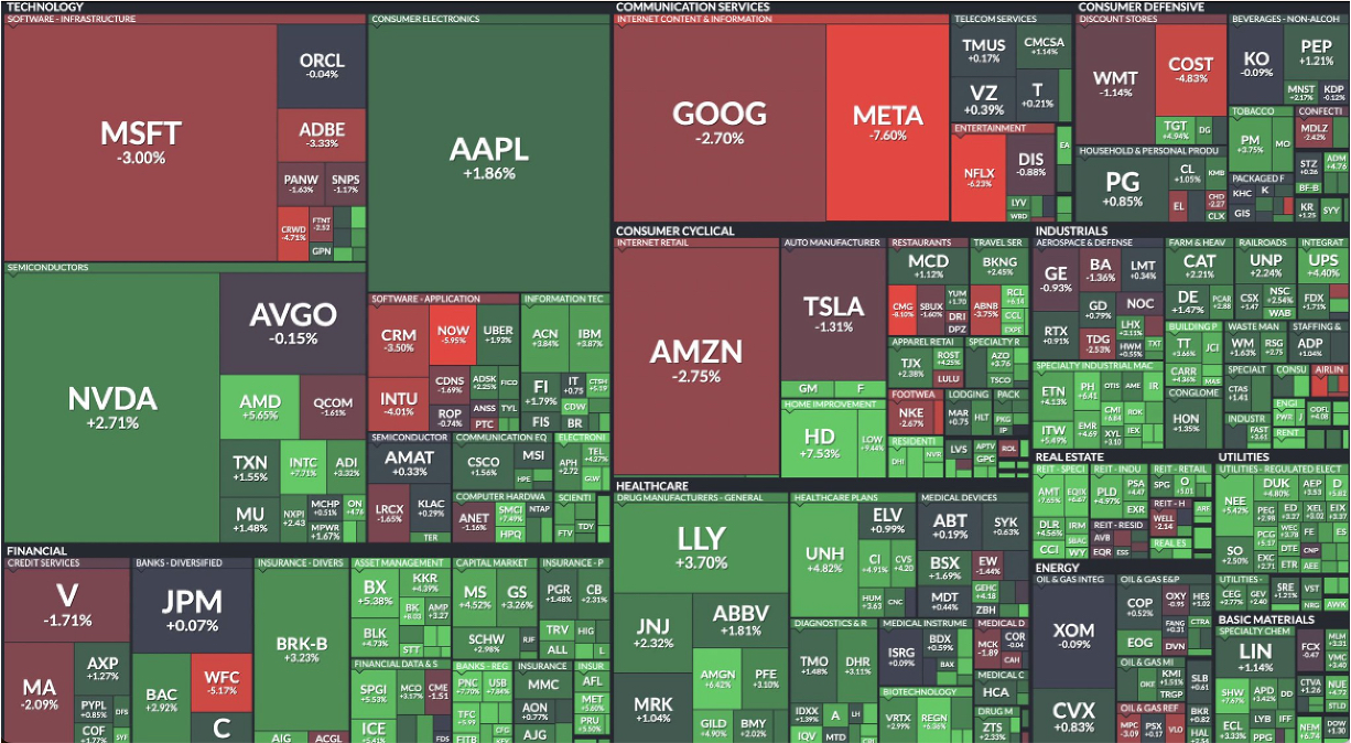As mentioned in previous editions, when a few key players dominate the indexes, the entire market can catch a cold if they sneeze. This week, Microsoft, Google, Amazon, and Meta all stumbled, causing the Nasdaq (NDX) to end the week relatively flat. Nvidia, Apple, Lilly, and Berkshire Hathaway stepped up to soften the blow.