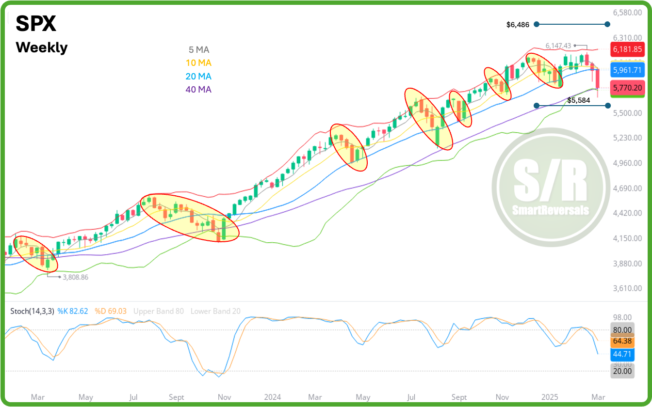 The SPX has now recorded its fourth consecutive red week, with price action aligning with last week's charts, which showed a bearish candle resting on the 40-week moving average (MA) but lacking additional bounce indicators.