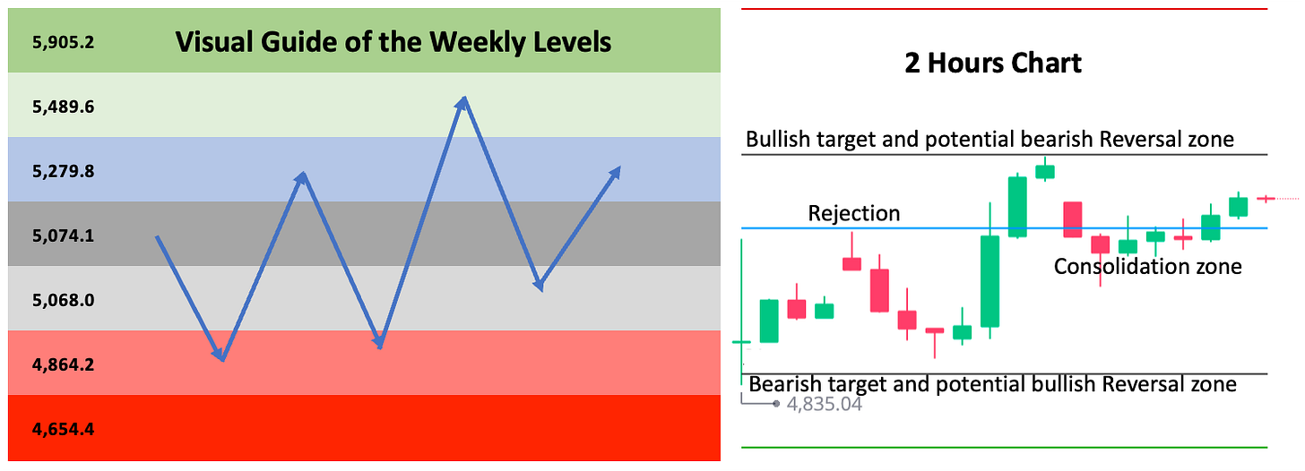 Last weekend, I developed a graphic model outlining potential price action scenarios for this week, guided by the color key on the left. Price action moved with notable precision within these scenarios, finding weekly support around $4,864, consolidating near $5,729, and experiencing a significant rejection very close to $5,489 on Wednesday.