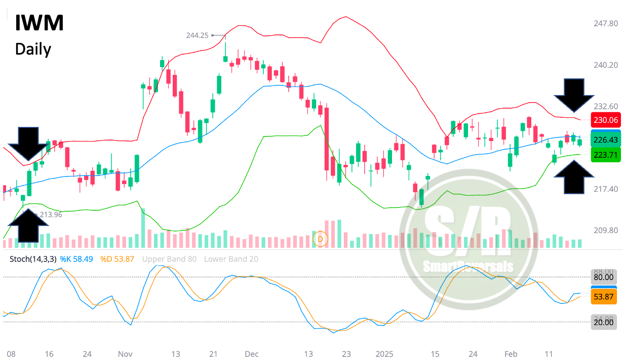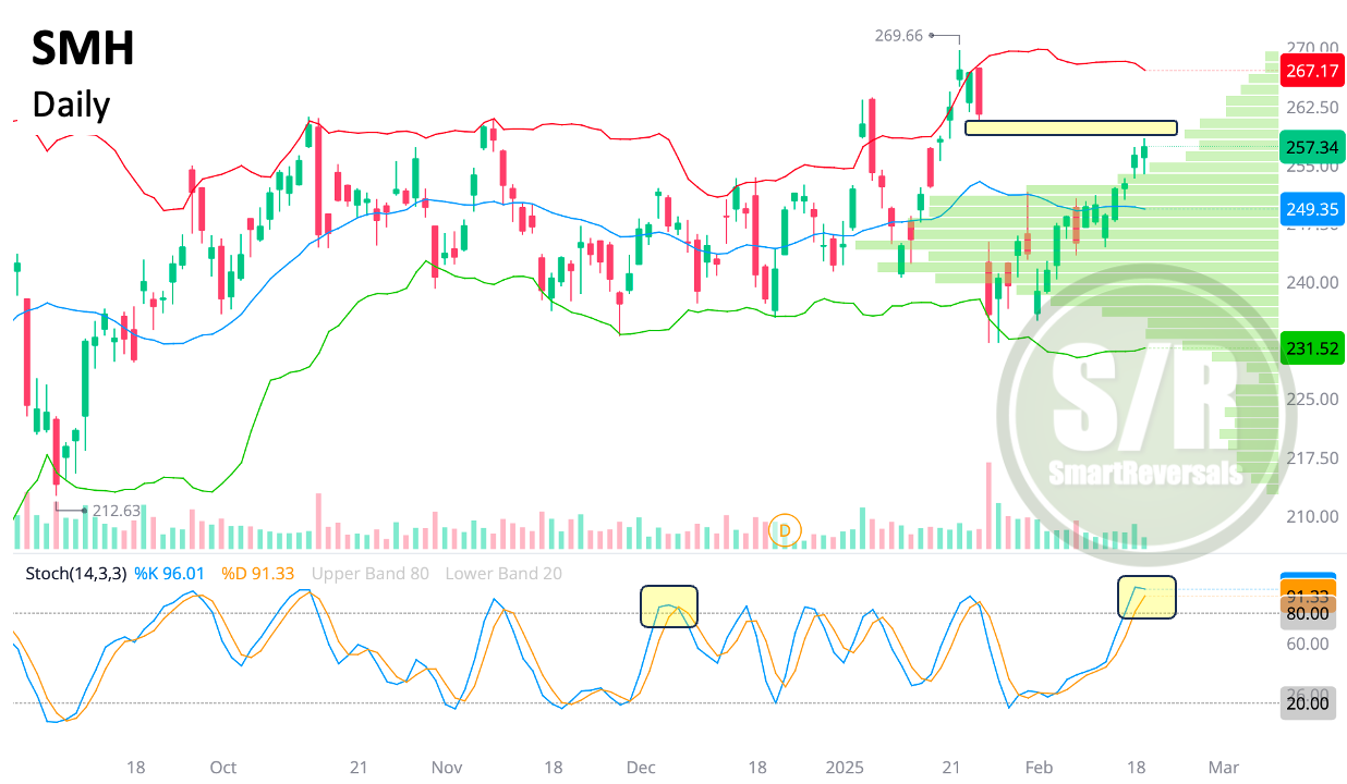 SMH, with a potential bearish crossover on the oscillator and price action breaking away from the volume shelf, monitoring the $255.7 level is prudent for tight risk management. If a wider range is desired, the $250.1 level becomes critical. Let’s remember that lately the pullbacks have reached the lower Bollinger band and matched a bearish weekly target.