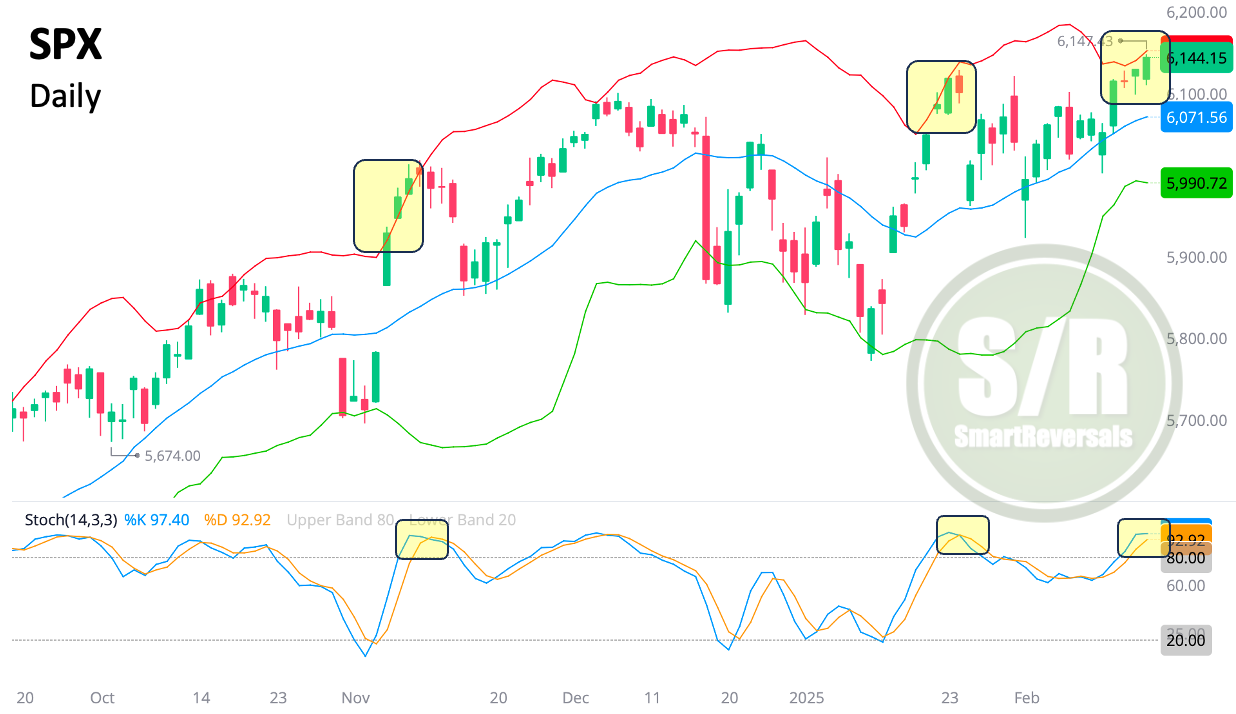 The SPX broke out to the upside today after two consecutive indecisive daily candles. The widening Bollinger Bands suggest potential for further gains. This upward move isn't entirely unexpected, as price action has remained above the key $6,082.6 central level for the week, increasing the likelihood of a move toward $6,160.4. However, caution is warranted as the oscillator is overbought and showing signs of turning downward. It's important to remember previous instances where price approached the upper Bollinger Band and the oscillator curled down, often preceding a pullback.