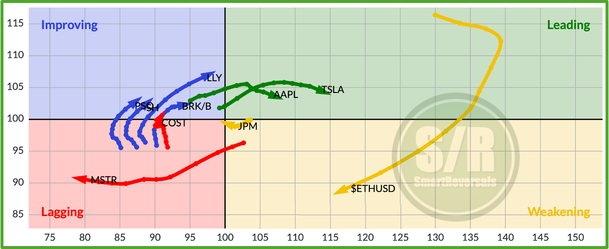 Our combined approach—enriching technical indicators and momentum analysis with Support and Resistance (S/R) levels—provides clarity, with a simple “bullish above and bearish below” framework for navigating securities. Both LLY and COST are included in the current S/R levels edition. Finally, inverse ETFs like SH and PSQ (which move opposite to SPY and QQQ, respectively) were oversold and are now bouncing, moving cyclically through the Map’s quadrants.