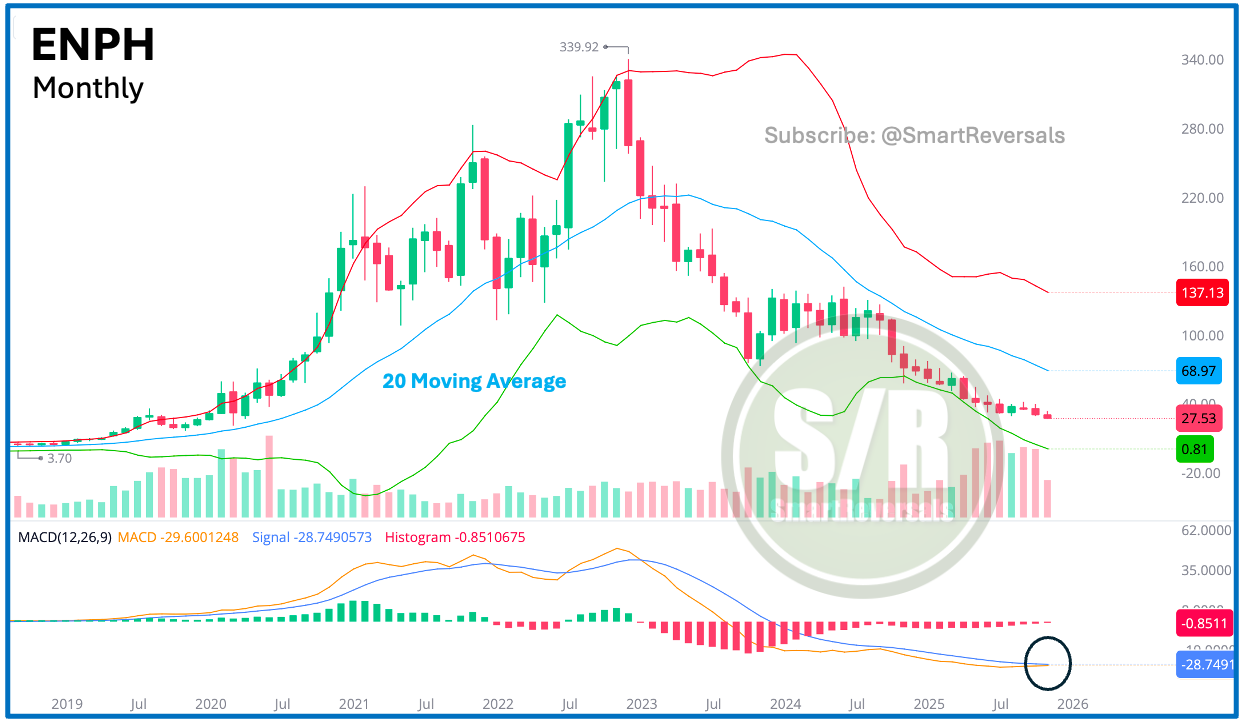 ENPH has not yet found a bottom in 2025. Price action continues to drift lower, and the lower Bollinger Band is far from acting as support. It is worth noting that the MACD oscillator is curling up; a bullish crossover on the monthly timeframe would be a major signal to watch, potentially indicating a price spike for bulls.