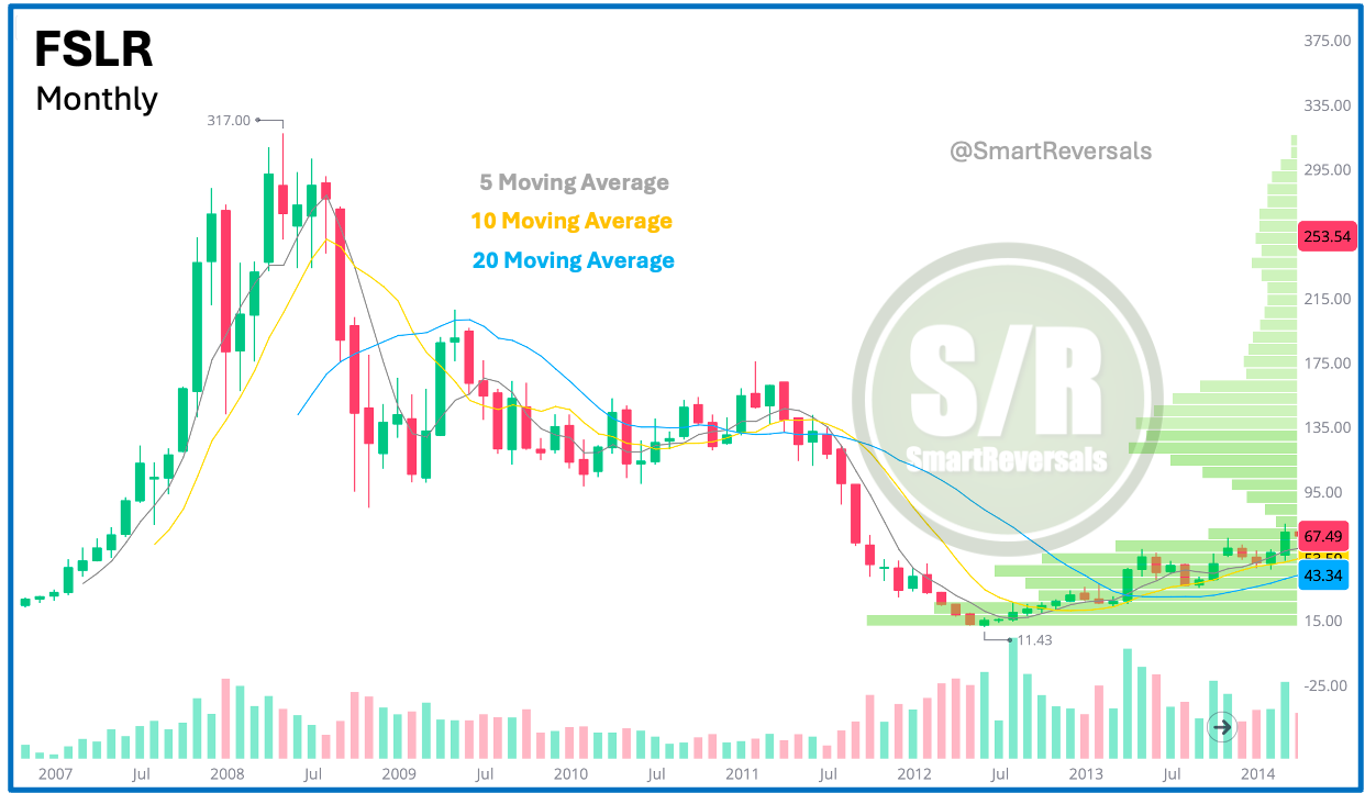 First Solar (FSLR) is a name frequently traded today. The stock is currently attempting to form a bullish Cup-and-Handle pattern which, following a pullback (the handle), could target $377. The price must successfully surpass $281. However, let’s analyze the pullback that followed its 2008 peak of $317, which was set by an indecisive monthly candle. When FSLR lost the 5-month Moving Average (a major warning sign for any bullish security), the stock plummeted -73% in seven months, a decline accelerated by the Global Financial Crisis. Critically, while the S&P 500 bounced in March 2009, FSLR continued to fall, resulting in a total selloff of -96% from its all-time high. When you buy a specific asset that has been rallying in a parabolic fashion you must do three things: