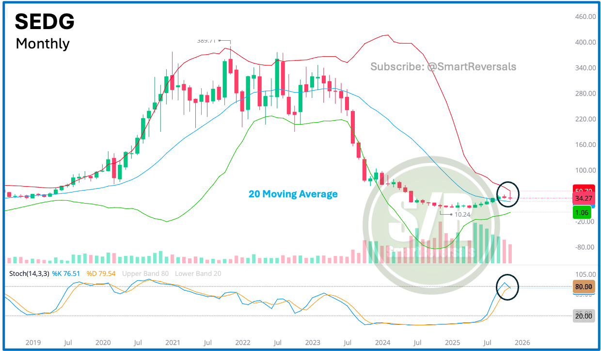 Canadian Solar (CSIQ) printed indecisive price action, forming a ‘shooting star’ candle that reveals how an intra month rally completely faded. On monthly timeframes, this formation is a major signal that demands attention. (For a quick homework assignment, check the October 2025 monthly candles for MSFT and Bitcoin to understand what is currently unfolding in November).