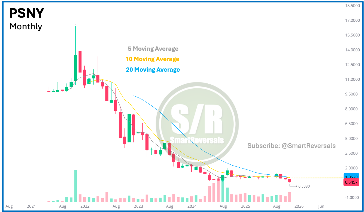 The electric vehicle euphoria was indeed a global phenomenon. After studying a Chinese and an American example, let’s conclude with a European one: Polestar Automotive Holding PSNY. Adding moving averages to the chart immediately reveals the persistent downtrend. Crucially, the 20-month Moving Average has consistently acted as resistance, and the price is currently showing renewed signs of continuation lower.