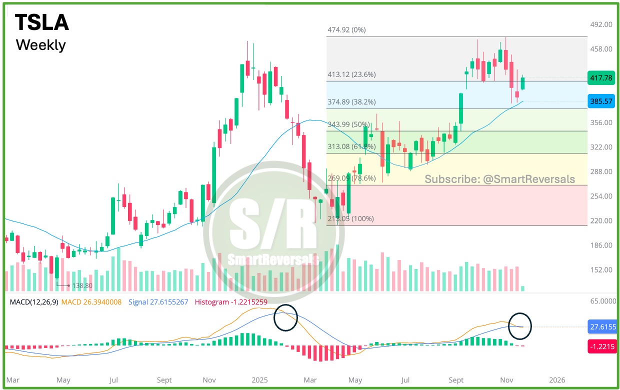 For Tesla (TSLA), we see a textbook example of “confluence,” where the price found firm support exactly at the 38.2% Fibonacci zone, perfectly coinciding with the rising 20-weekly moving average. This structural defense suggested the bounce just observed; however, the bulls need to deliver a decisive and powerful rally to negate the looming threat in the subchart. The MACD is currently initiating a bearish crossover, a major momentum warning that mirrors the significant trend reversal witnessed in February 2025 (highlighted in the chart). Investors must watch closely: while the 20 weekly average is currently acting as a floor, a sustained breach of this line would confirm the bearish crossover and signal a deeper continuation to the downside.