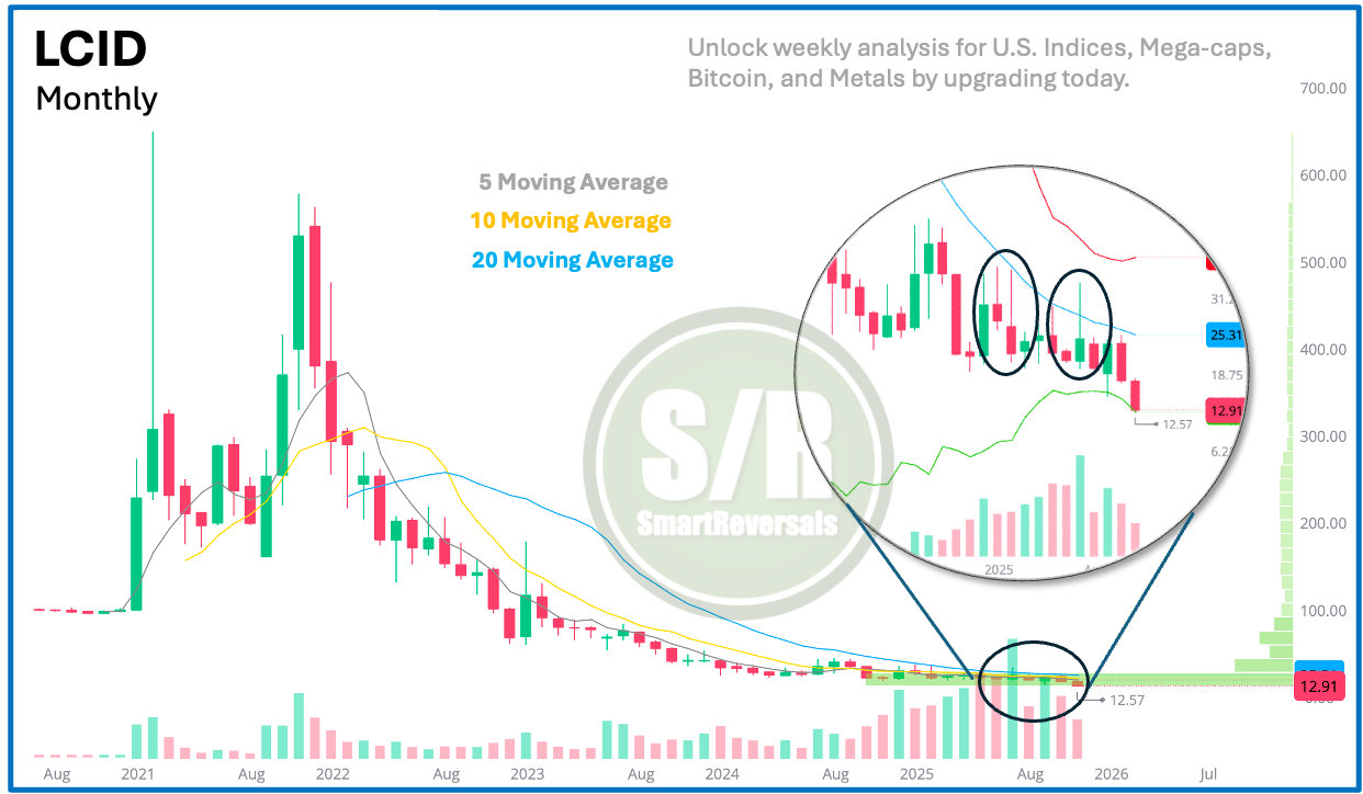 LUCID offers yet another case study in EV stock euphoria. The stock embarked on a wild ride, first spiking 571% in five months, followed by a dramatic 75% crash over the next eight months. After a brief, powerful 261% rally, the price has failed to sustain any momentum and has trended relentlessly lower ever since. The stock now trades below its initial public offering price (IPO). Recent price action confirms this weakness, showing a clear rejection from the 20-month Moving Average as the downtrend accelerates.