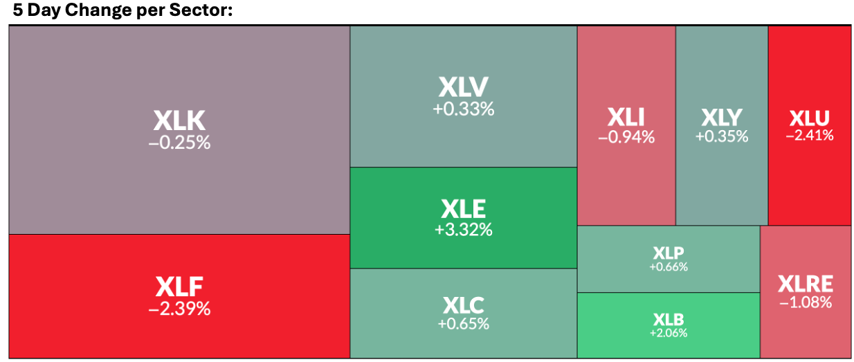 U.S. stocks concluded a very volatile week with divergent performance, as strength in mega-cap technology shares counterbalanced broad-based weakness elsewhere. The S&P 500 finished -0.35% for the week, the Nasdaq Composite gained 0.3% for the week, and the Dow Jones Industrial Average retreated 0.6%. Investor sentiment remains anchored in neutral territory, with the Fear & Greed Index reading 52.