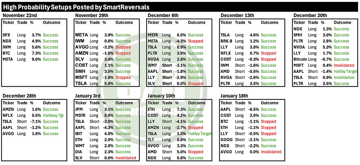 Even in highly volatile weeks like the one just ended, our high probability setups delivered an average gain of +3.2% across both long and short positions, with an average loss of only -0.7% for the setups that were affected by the rapid selloff. The week that just ended was brutal, and despite of that, this professional approach over-performed. Note that the full setups menu is much broader than what is presented in this preview, the bearish targets for TSLA, BRK.B, AMZN, PLTR, MSFT, META, and NFLX were reached. Ensure you have the right tools to navigate the current market. Subscribe now, this market neutrality and setups pay the subscription.
