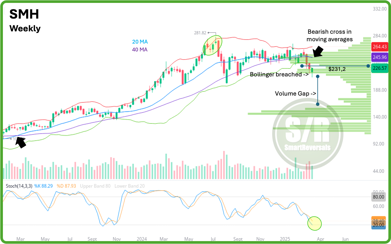 SMH is poised for a bounce next week, following two consecutive weeks of Bollinger Band breaches. Support was established between the previously shared weekly levels of $216.3 and $207.5. A bullish continuation is expected above $221.3, targeting $232.2. Conversely, a drop below this level could lead to a bearish continuation towards $215.17. The strong annual level at $231.2 warrants caution upon reaching that price, as it may induce rejection. For the medium and long term, the chart continues to signal caution for bulls, given the impending bearish crossover of the 20 and 40-week moving averages, and the highlighted volume gap. Rapid price movements are common between gaps, and the oscillator is not yet oversold.