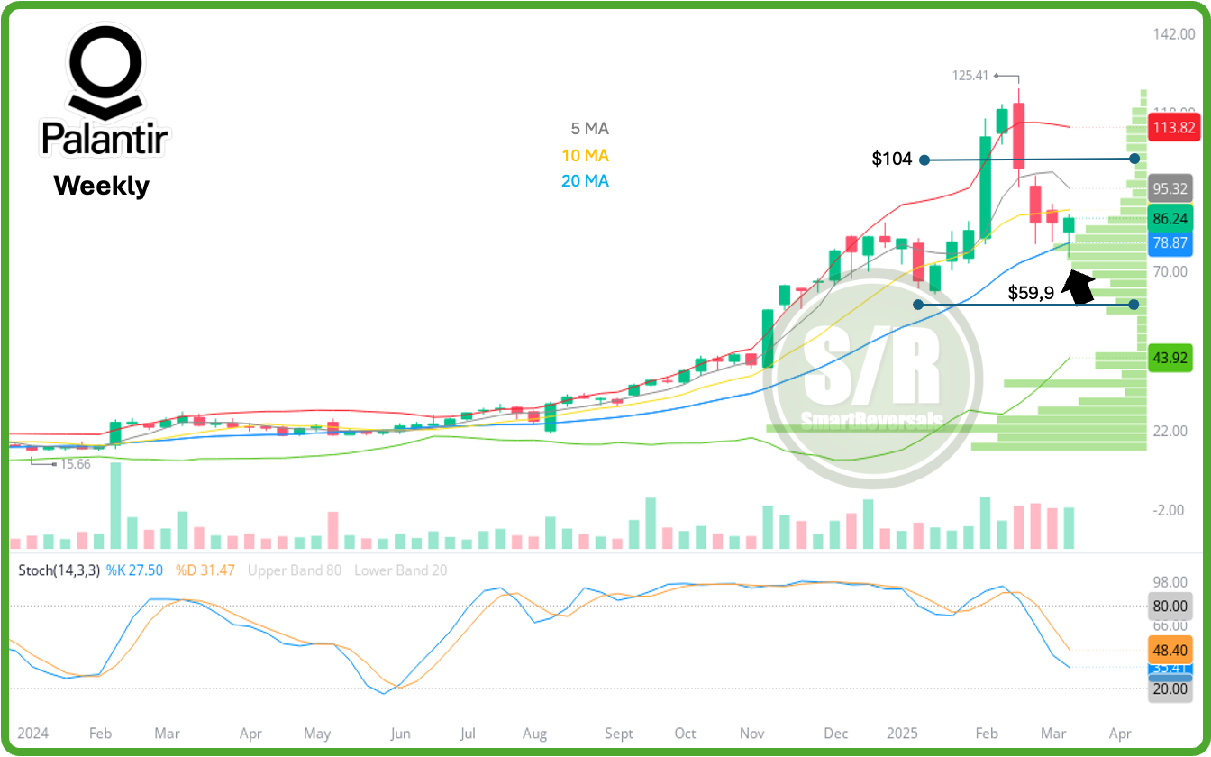 PLTR: Consistent with last week's analysis, PLTR was one of the few stocks, along with precious metals and MSTR, exhibiting bullish patterns. The point of control maintained its support role, converging with the 20-week moving average. Price action recovered from the $73.5 secondary weekly support and proceeded to cross the central weekly level. The two latest weekly candles suggest a potential end to the selling pressure. PLTR continues its pattern of wide price swings. A bullish continuation is expected if $82.7 remains as support, with a target of $90.8 and potential extension to $95.4 if there is a broad market rally (something to analyze below with SPX and NDX). Conversely, a break below $82.7 could initiate a bearish reversal, targeting $78.1.