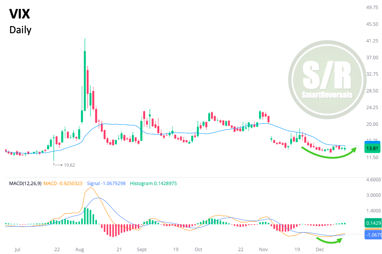 Opposite to price action in SPX, the VIX is showing signs of a reversal with a slow ascending move and most importantly, a bullish MACD crossover that usually precedes spikes in volatility. Both events are highlighted by green arrows.