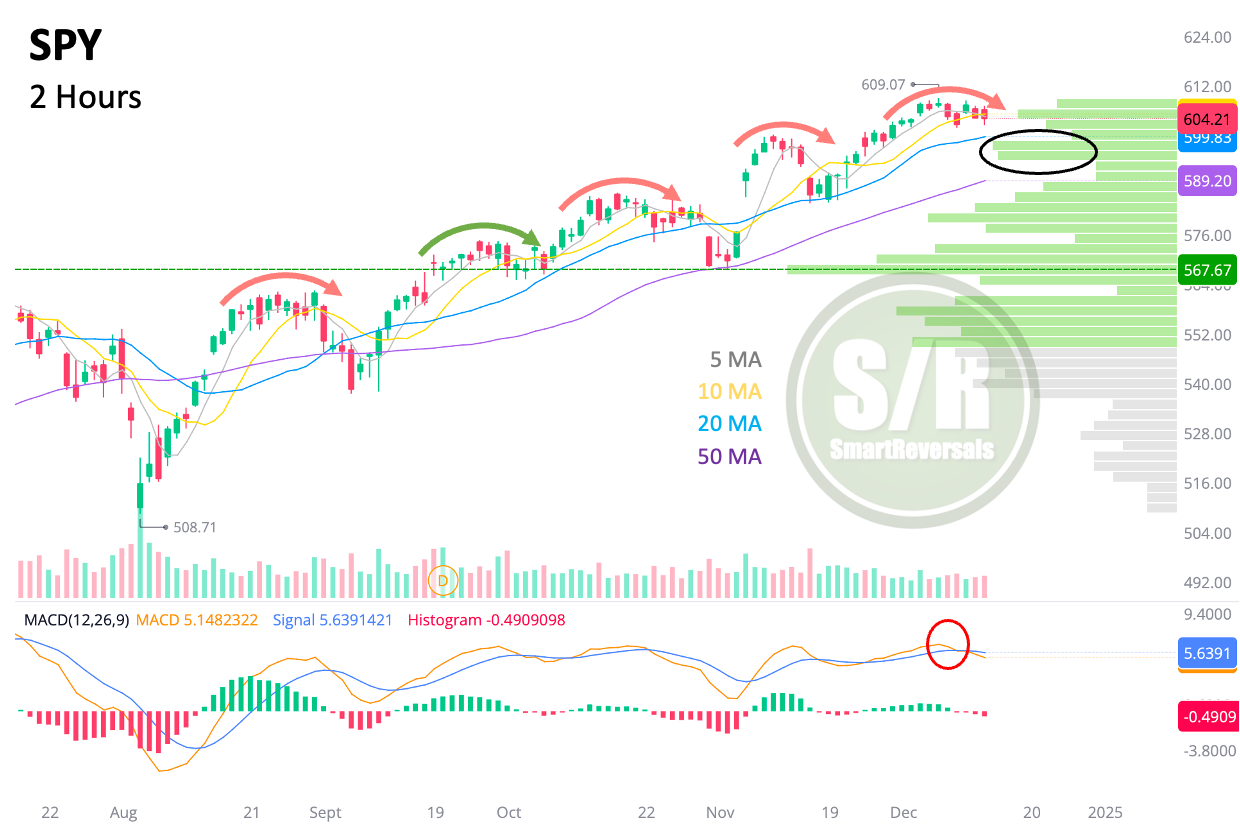 Analyzing the inverse case, SPY sows an inverse MACD cross, suggesting a bearish move incoming, and the 20DMA is a very likely destination for the SP500 ETF next week.