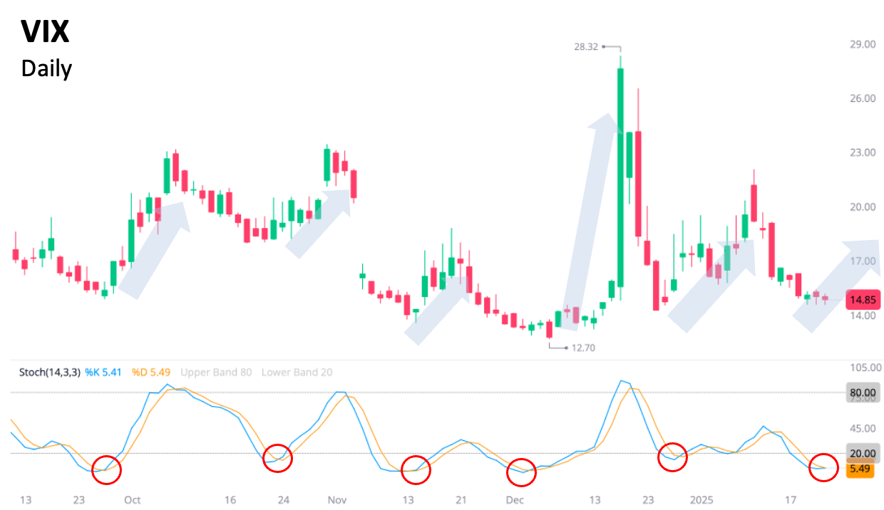 Just observe the chart, the red circles present crossovers that precede spikes in the Volatility Index, and there is a new crossover today that suggests a spike is coming. The indecision candles are quite bouncy as well.