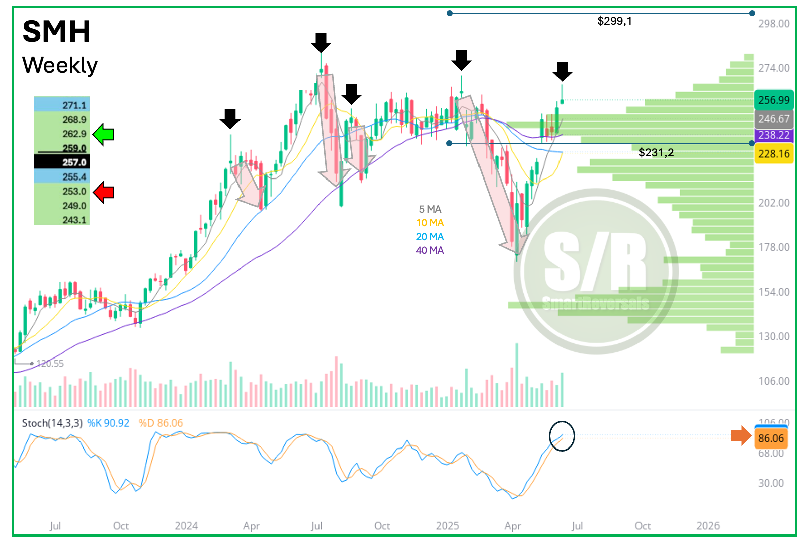 On Friday, June 6th, I published the support and resistance levels for the week ahead including SMH in over 40 securities. In that analysis, $249 was identified as the level dictating bullish momentum if the price remained above it. The bullish targets, or layers, were set at $259.5, which caused a temporary rejection on Monday, and $266.3, which indeed acted as a firm ceiling for semiconductors. Consequently, the price retraced from that zone, printing a weekly bearish candle.