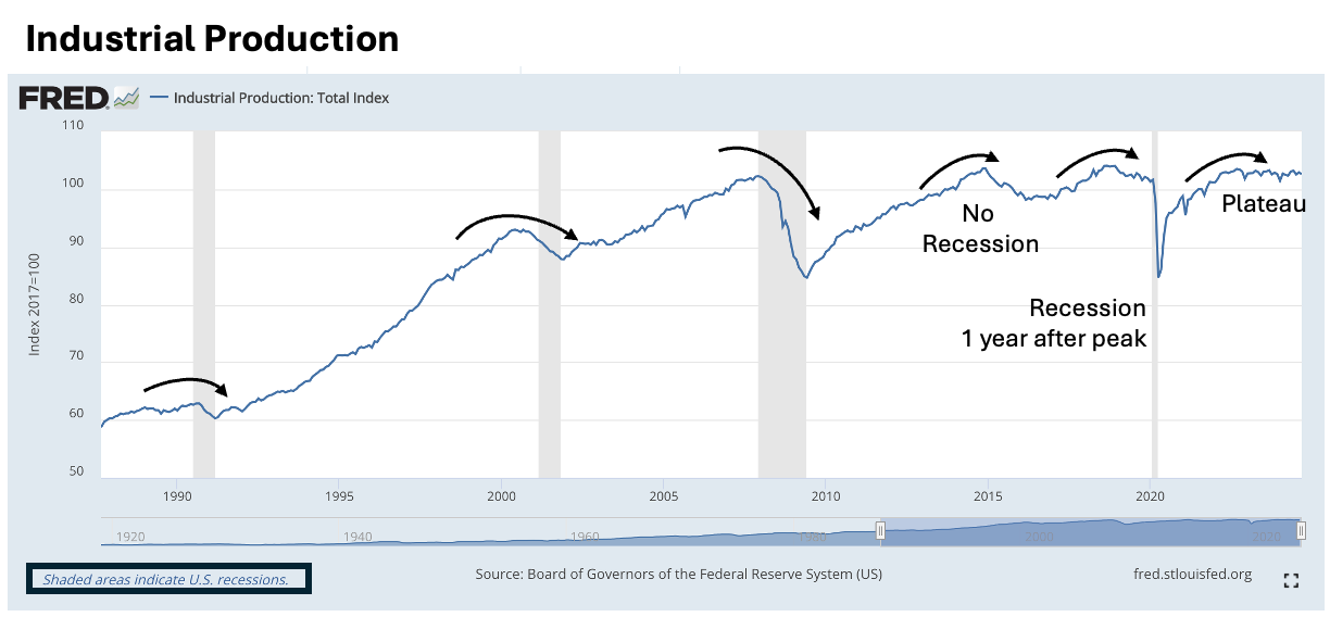 The Industrial Production continues in a plateau that is trying to curl down, the chart provides a visual of declines preceding or during recessions, it also shows cases without recessions like in 2015, or delayed recessions like the decline in 2019, followed by a recession after a year (and it was COVID). A curl down is not optimal, but don’t expect an immediate recession declared as the chart proves.