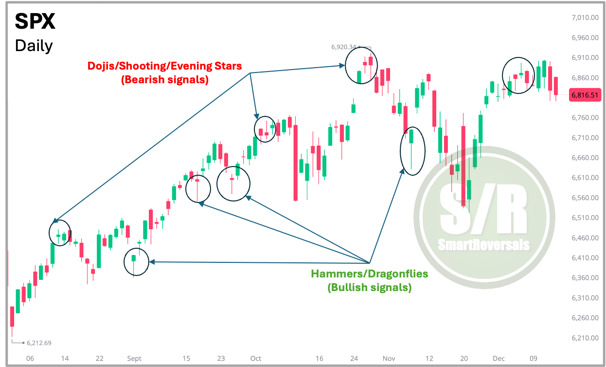 Candlesticks: Decoding Market Psychology To truly understand market sentiment, you must graduate from line charts to candlesticks. A line chart smooths over the details, but candlesticks reveal the tug of war between bulls and bears in every single session. As illustrated below, patterns like the “Shooting or Doji Star” (signaling a potential drop) or the “Hammer” (signaling a potential bounce) act as early warning systems. They allow you to spot the exact moment a trend gets tired or finds support, giving you the chance to react before a full reversal becomes obvious.