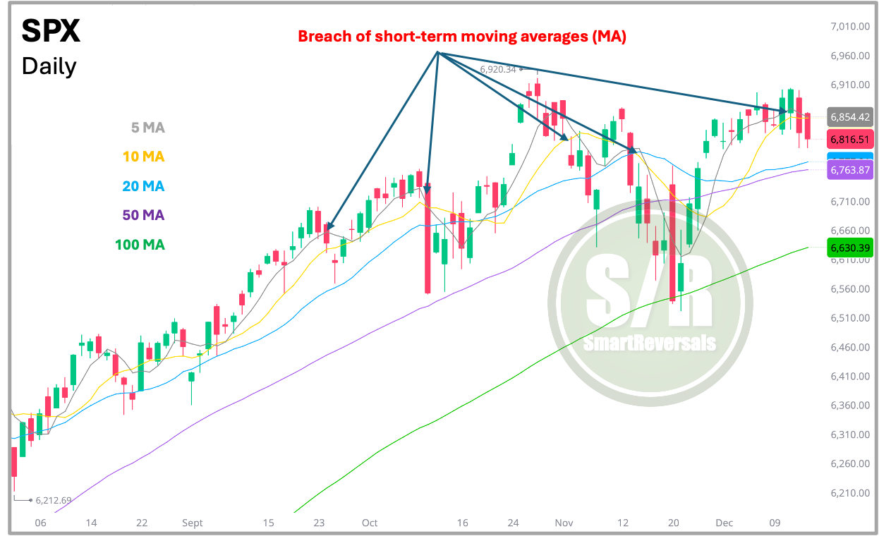 The interaction is key: losing a short-term MA indicates fading momentum, whereas violating a significant level like the 50 or 100 MA often signals a fundamental shift in market direction. See where the price bounced from three weeks ago (100DMA), and two months ago (the 50DMA).