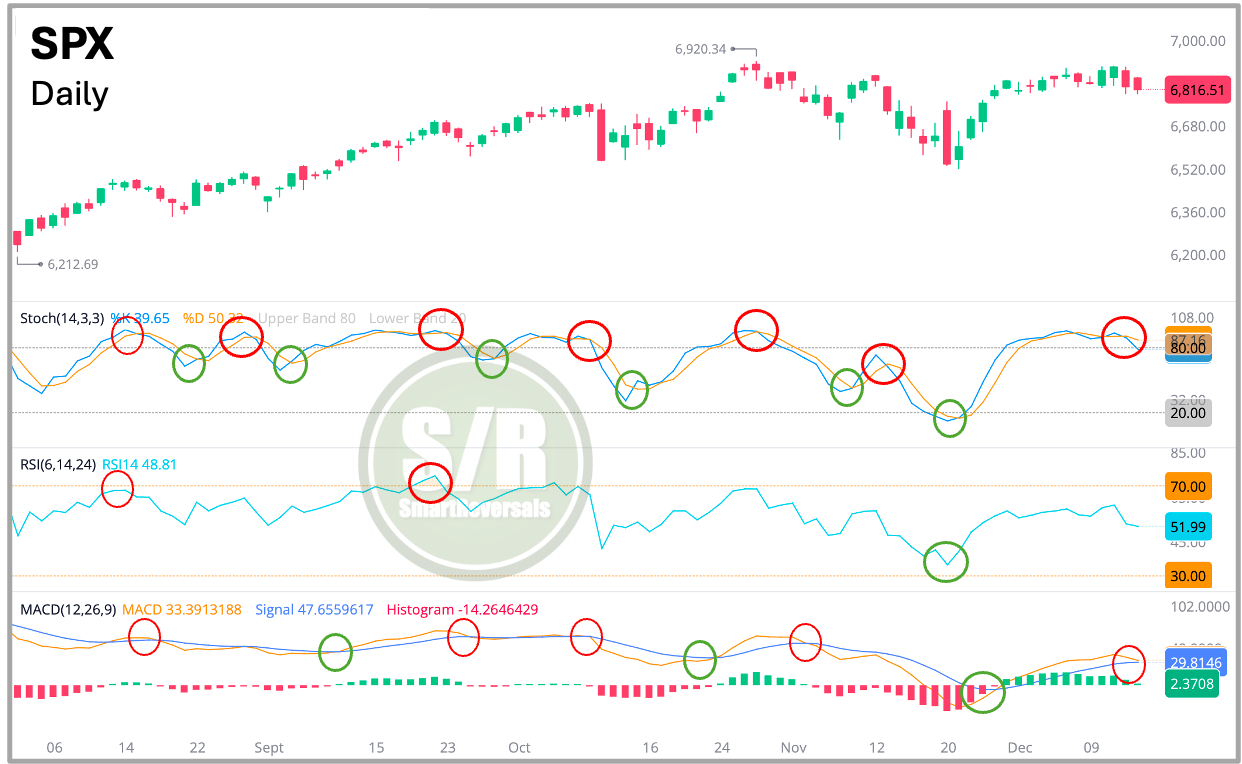 As shown in the chart below, these tools behave differently. The Stochastic is the “sprinter” it reacts fast. While readings above 80 (overbought) or below 20 (oversold) signal potential reversals, be aware that in strong trends, it can stay “pinned” in overbought territory. The RSI is the “marathon runner”, it moves slower and smooths out the noise. When RSI hits 70, the asset is significantly extended; below 30, it is heavily discounted. Finally, the MACD acts as a confirmation filter, helping you judge the strength of a trend or a reversal.