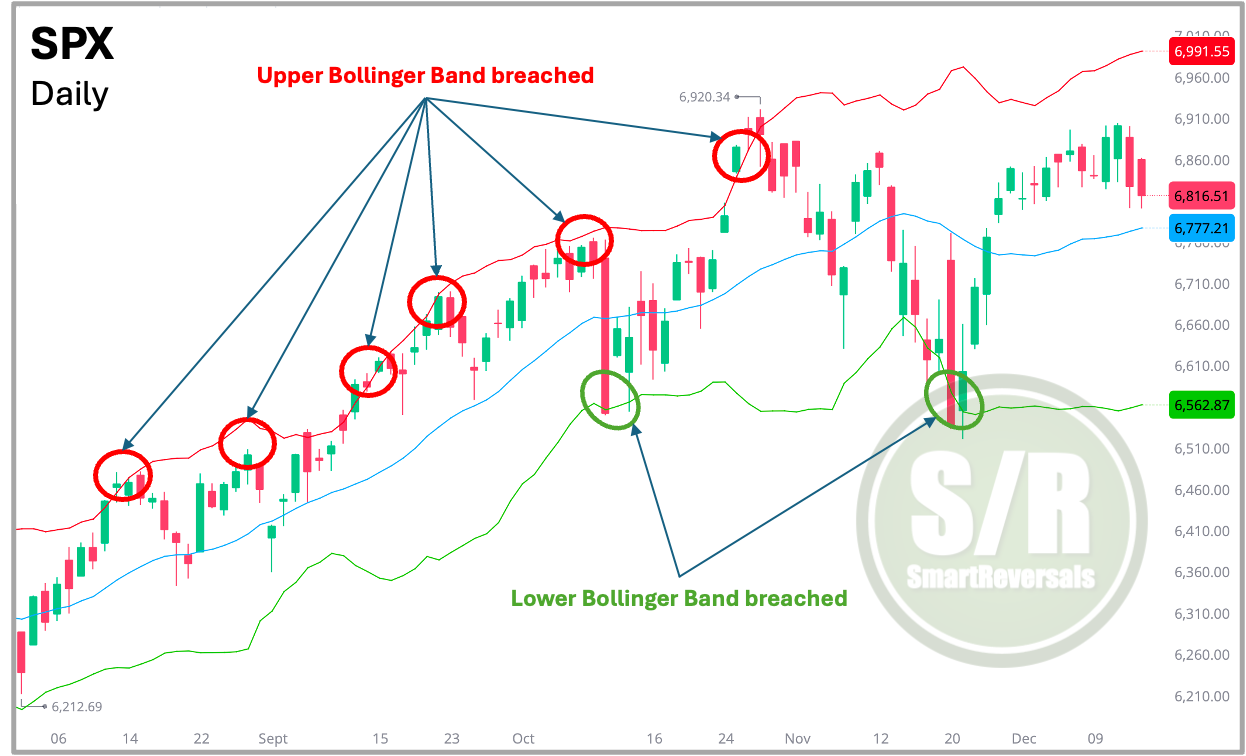 Bollinger Bands: The Boundaries of Price To gauge whether a move is sustainable, we add Bollinger Bands. These bands create a visual corridor based on volatility. As shown in the fourth chart, price rarely stays outside these limits for long.